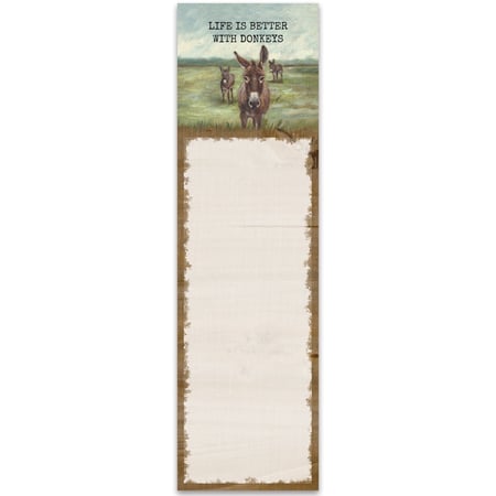 A list notepad from our Farmhouse Collection displaying a charming scene of donkeys in a field with a farm inspired sentiment that reads "Life Is Better With Donkeys" and a decorative space underneath for writing. Donkey design is replicated from original artwork painted onto burlap canvas, giving the art a unique depth and texture. Our Better With Donkeys list pad includes 60 pages and a strong magnet to easily hang on magnetic surface for display. Proudly made in the USA. A fun farm-themed gift perfect for adding functional style to any space.