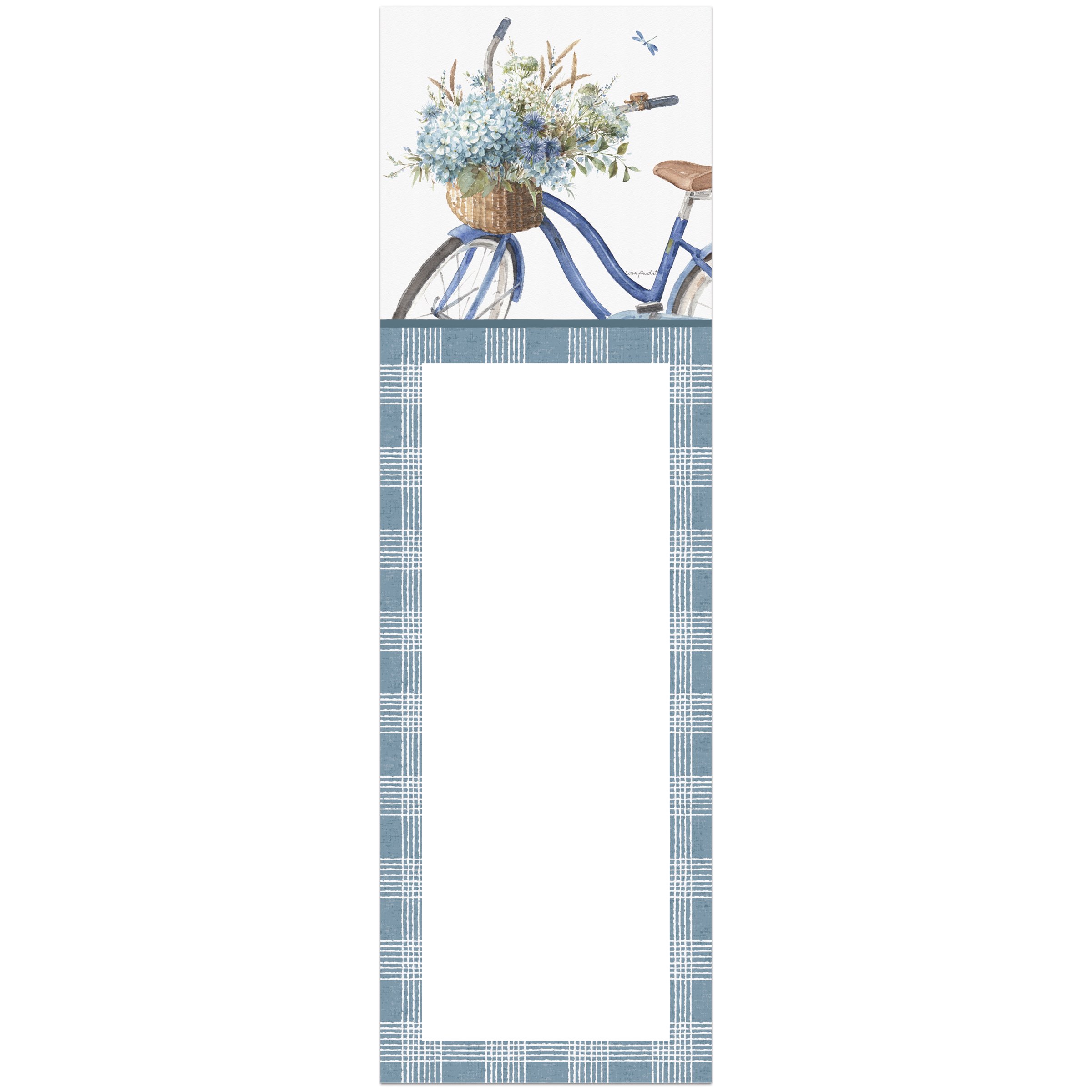A list notepad from our Indigo Collection displaying a beautiful blue floral bouquet in a vintage bicycle basket with blank writing space underneath and a coordinating indigo inspired plaid pattern along the border. Design is replicated from original artwork hand painted in a delicate watercolor style. Our Blue Floral Bike list pad includes 60 pages and a strong magnet to easily hang on magnetic surface for display. Proudly made in the USA. A charming everyday accessory perfect for adding functional style to any space.