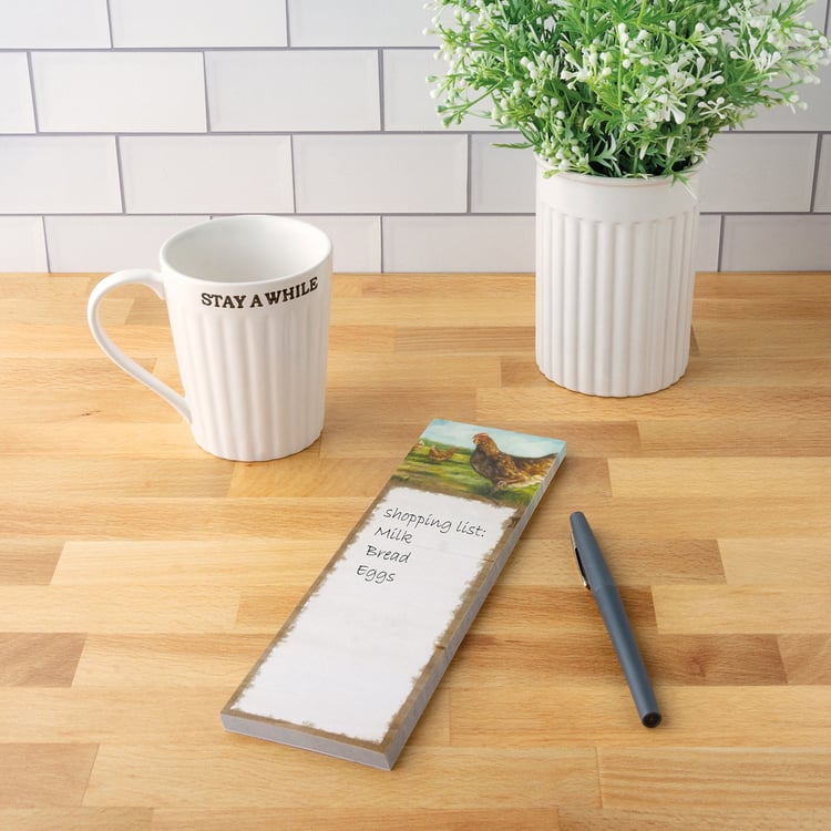 A list notepad featuring chickens in a field design. Design is replicated from original artwork painted onto burlap canvas, giving the art a unique depth and texture. Our Curious Chicken list pad includes 60 pages and strong magnet. Made in the USA.