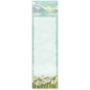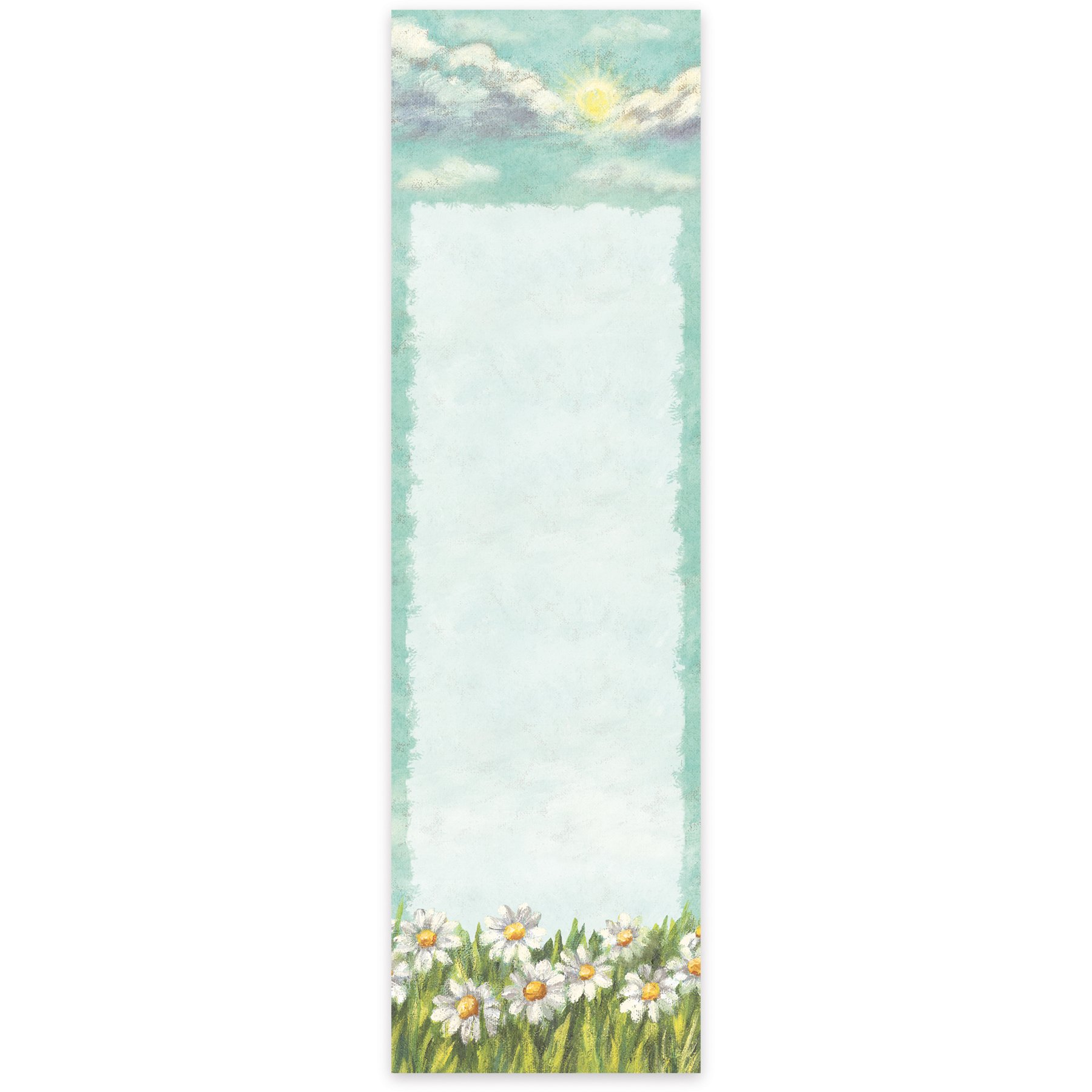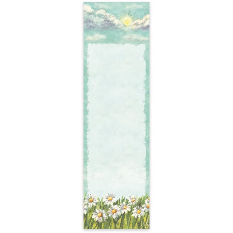A list notepad from our Garden Collection displaying a hand painted design of a bright sky and a field of daisies with a decorative space to write in between. Design is replicated from original artwork painted onto burlap canvas, giving the art a unique depth and texture. Includes 60 pages and a strong magnet to easily hang on magnetic surface. Our Daisies list pad is proudly made in the USA.