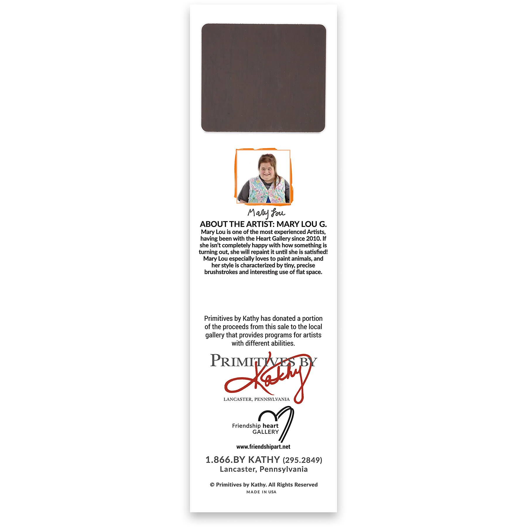 A list notepad from our Friendship Heart Gallery Collection displaying a hand painted design of a donkey wearing florals. Design is replicated from original art created at the Friendship Heart Gallery in downtown Lancaster, PA by artists with intellectual disabilities and autism. Includes 60 pages and a strong magnet to easily display on magnetic surface. Our Donkey list pad is proudly made in the USA. A charming everyday accessory perfect for any space.