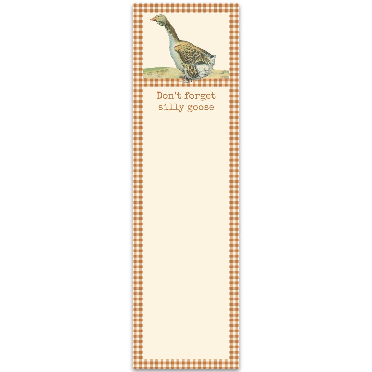 A list notepad from our Farmhouse Collection displaying vintage art of a goose with an orange gingham border around a blank writing space and a fun goose-themed pun that reads "Don't Forget Silly Goose." Our Don't Forget Silly Goose list pad includes 60 pages and a strong magnet to easily hang on magnetic surface for display. Proudly made in the USA. A fun farm-themed gift perfect for adding functional style to any space.