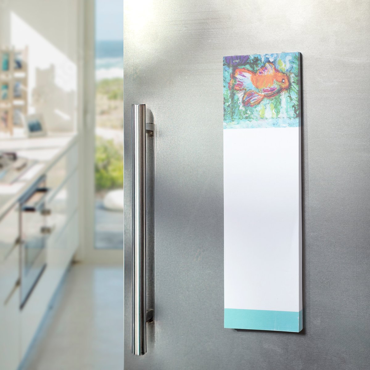 A list notepad from our Friendship Heart Gallery Collection displaying a uniquely hand painted scene of a goldfish with blank space underneath for writing. Goldfish design is replicated from original art created at the Friendship Heart Gallery in downtown Lancaster, PA that supports artists with intellectual disabilities and autism. Our Goldfish list pad includes 60 pages and a strong magnet to easily hang on magnetic surface for display. Proudly made in the USA. A pet-themed gift perfect for adding functional style to any space.