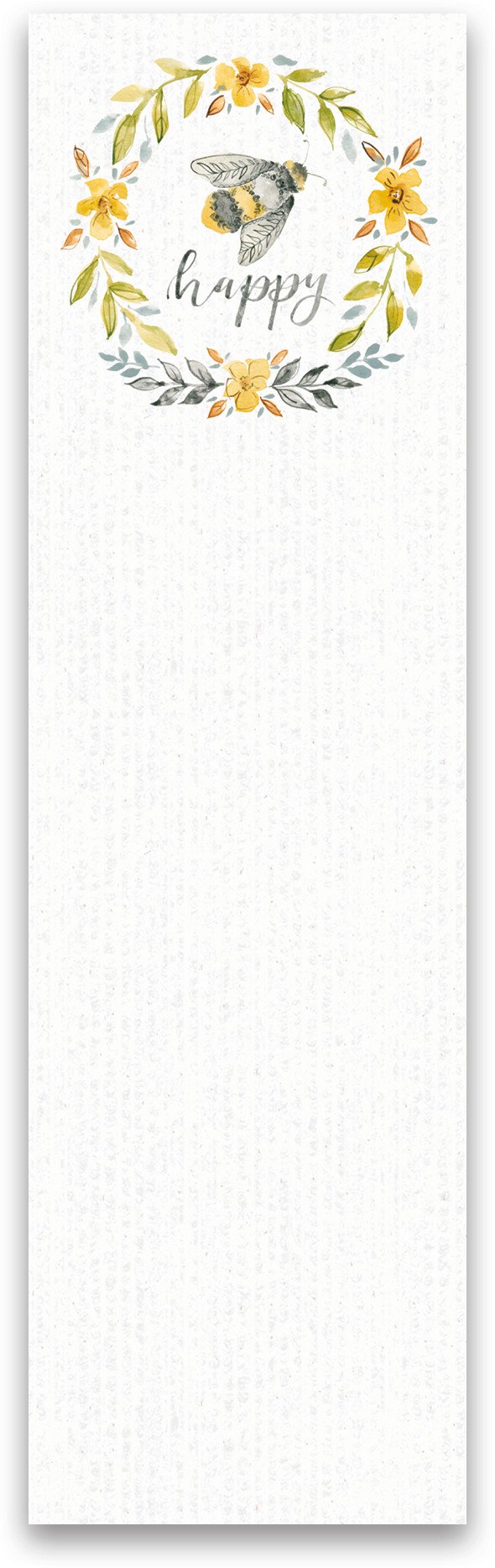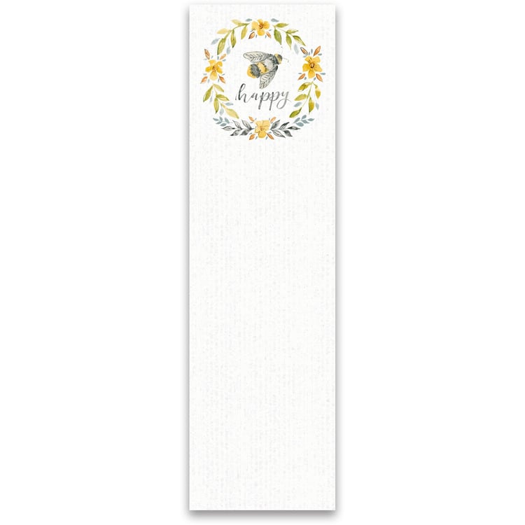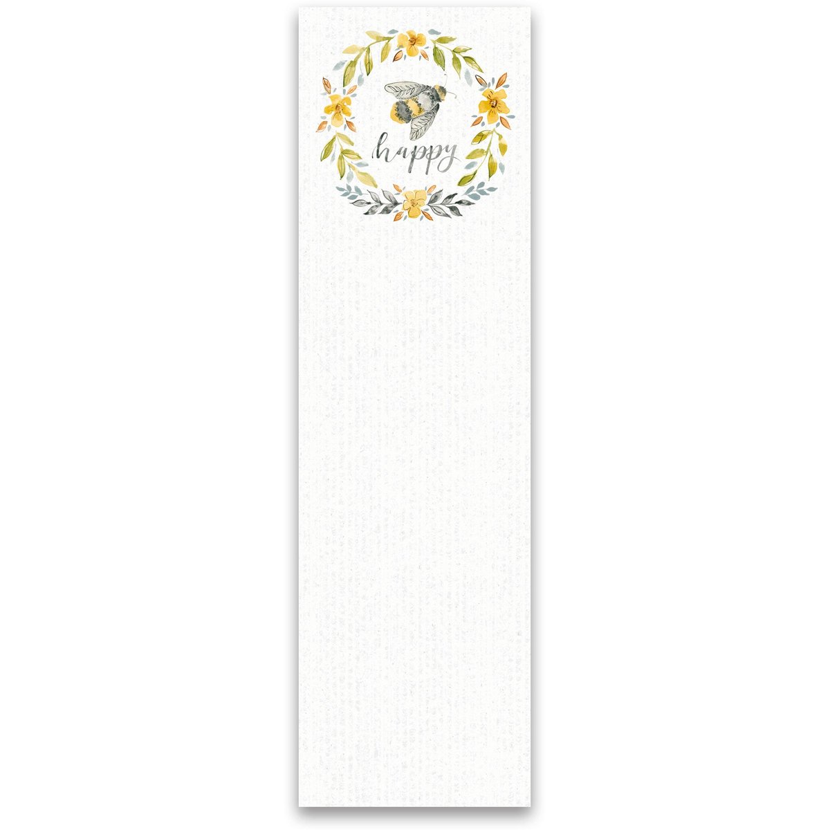A magnetic paper list notepad featuring watercolor artwork, "Happy" sentiment with bumblebee design, and floral wreath border. Contains 60 pages and strong back magnet. Complements well with coordinating pieces in collection for a refreshing spring display. Made in USA.