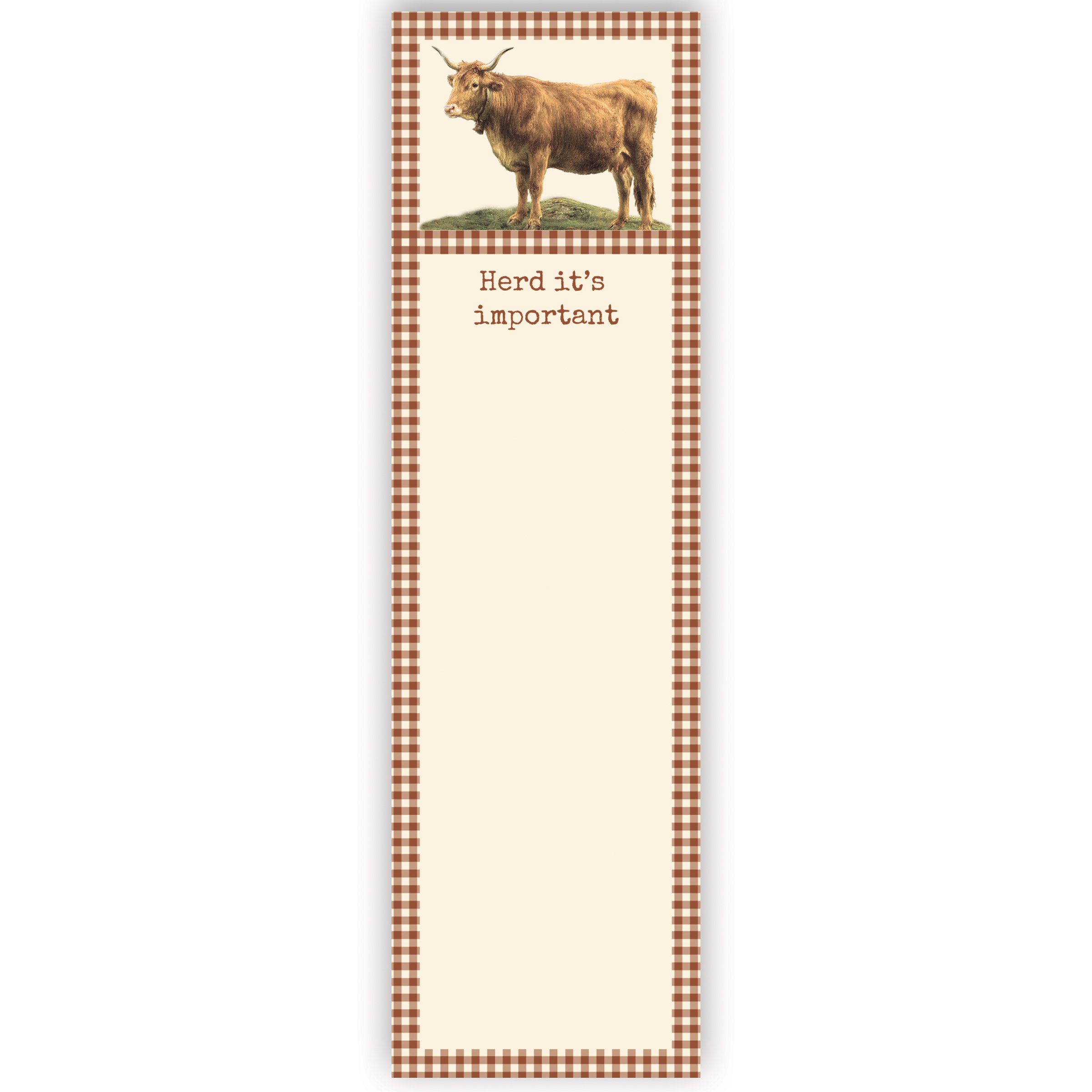 A list notepad from our Farmhouse Collection displaying vintage art of a farm cow with a brown gingham border around a blank writing space and a fun cow pun that reads "Herd It's Important." Our Herd It's Important list pad includes 60 pages and a strong magnet to easily hang on magnetic surface for display. Proudly made in the USA. A fun farm-themed gift perfect for adding functional style to any space.