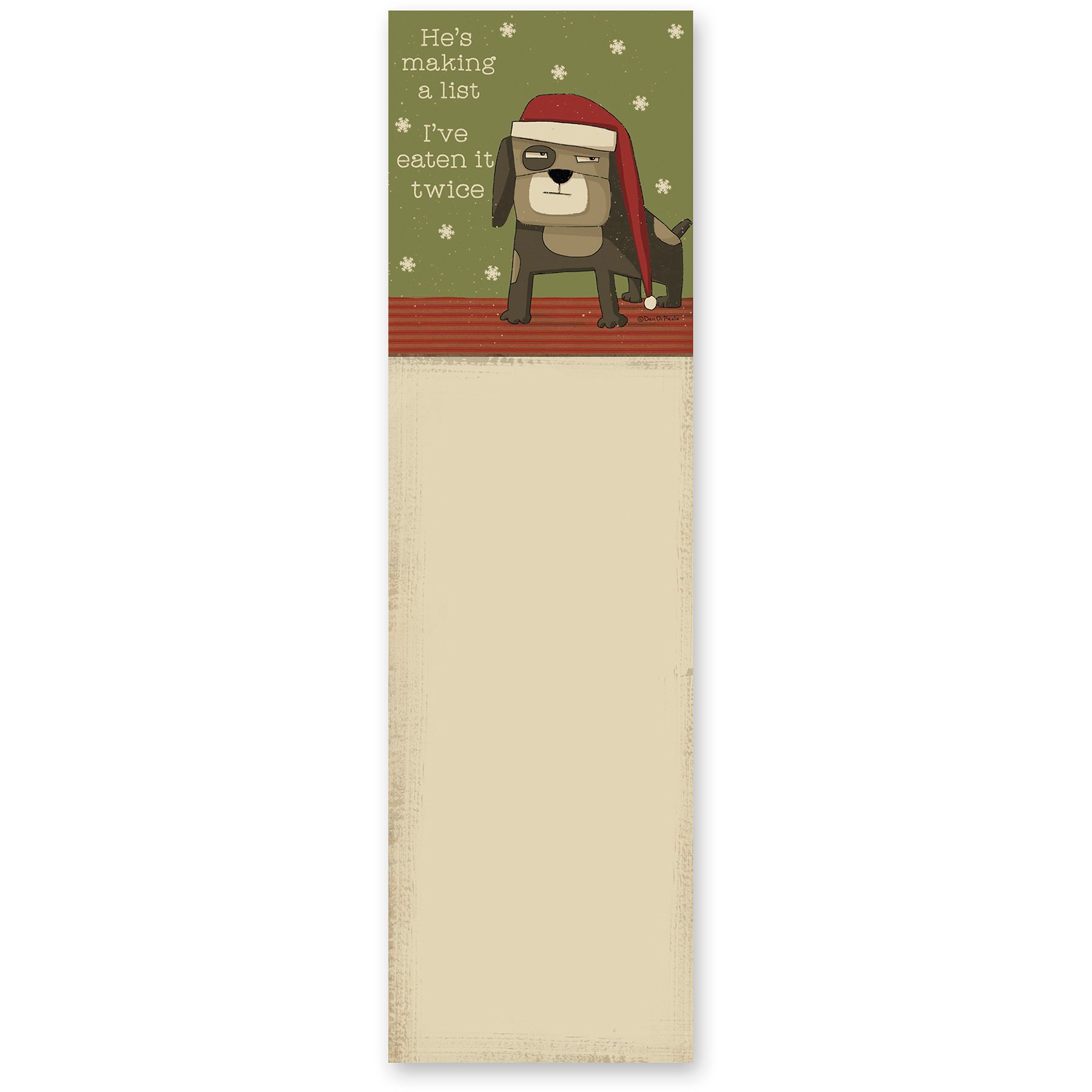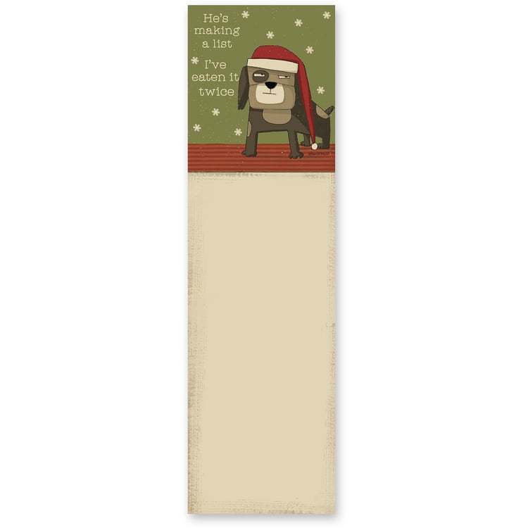 A list notepad displaying a rustic holiday design of a dog wearing a Santa hat and a fun dog inspired seasonal sentiment that reads "He's Making A List - I've Eaten It Twice" with decorative space to write underneath. Our Making A List pad includes 60 pages and a strong magnet to easily hang on magnetic surface for display. Proudly made in the USA. A fun pet-themed gift perfect for adding seasonal style and function to any space.