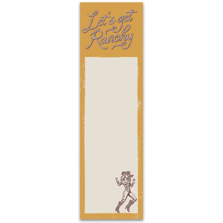 A list notepad from our Western Collection displaying fun illustrations of a cowgirl and western inspired sentiment that reads "Let's Get Ranchy" with a decorative blank space for writing. Our Let's Get Ranchy list pad includes 60 pages and a strong magnet to easily hang on magnetic surface for display. Proudly made in the USA. A fun western-themed gift perfect for adding functional style to any space.