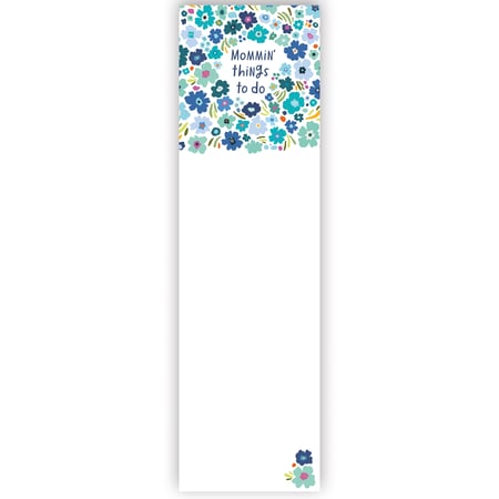 A list notepad from our Mother's Day Collection displaying colorful flower designs in a cool blue color palette surrounding a fun mom inspired sentiment that reads "Mommin' Things To Do" with blank space underneath for writing. Our Mommin' Things To Do list pad includes 60 pages and a strong magnet to easily hang on magnetic surface for display. Proudly made in the USA. A stylish gift for Mother's Day or everyday moments that can be used all year round.
