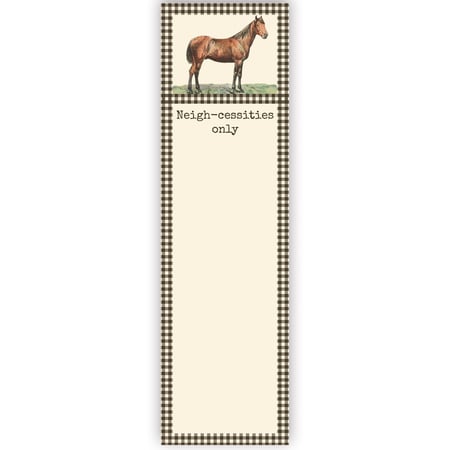 A list notepad from our Farmhouse Collection displaying vintage art of a horse with a black gingham border around a blank writing space and a fun horse pun that reads "Neigh-cessities Only." Our Neigh-cessities Only list pad includes 60 pages and a strong magnet to easily hang on magnetic surface for display. Proudly made in the USA. A fun farm-themed gift perfect for adding functional style to any space.