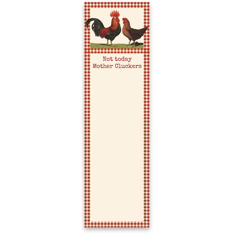 A list notepad from our Farmhouse Collection displaying a vintage design of a rooster and chicken with red gingham pattern around writing space and punny "Not Today Mother Cluckers" sentiment. Includes 60 pages and a strong magnet to easily display on magnetic surface. Our Not Today Mother Cluckers list pad is proudly made in the USA. A fun everyday accessory perfect for any space.