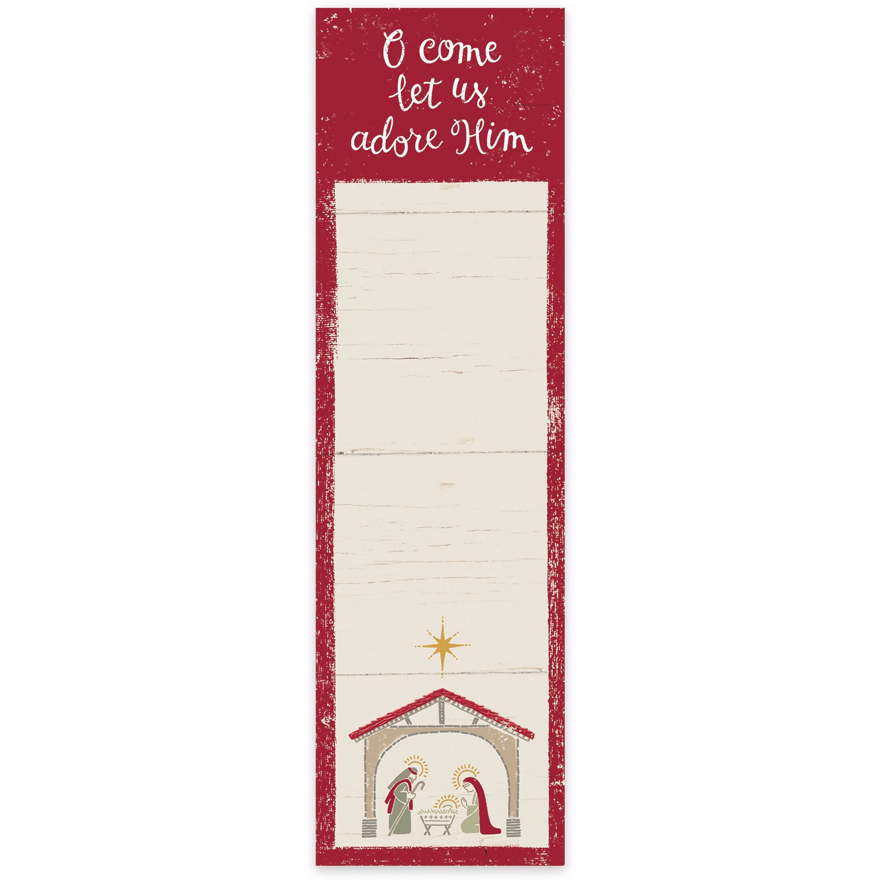 A fresh update for Christmas, a magnetic paper list notepad featuring an "O Come Let Us Adore Him" sentiment with bottom nativity scene design. Complements well with coordinating styles for a cohesive collection. Contains 60 pages and strong back magnet. Made in USA.