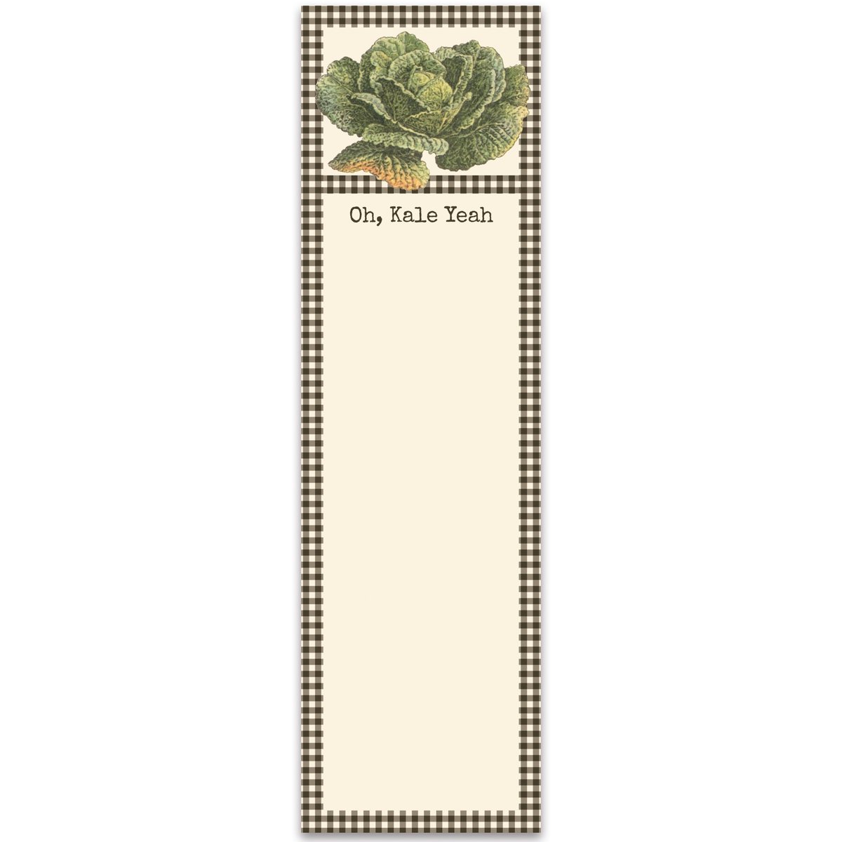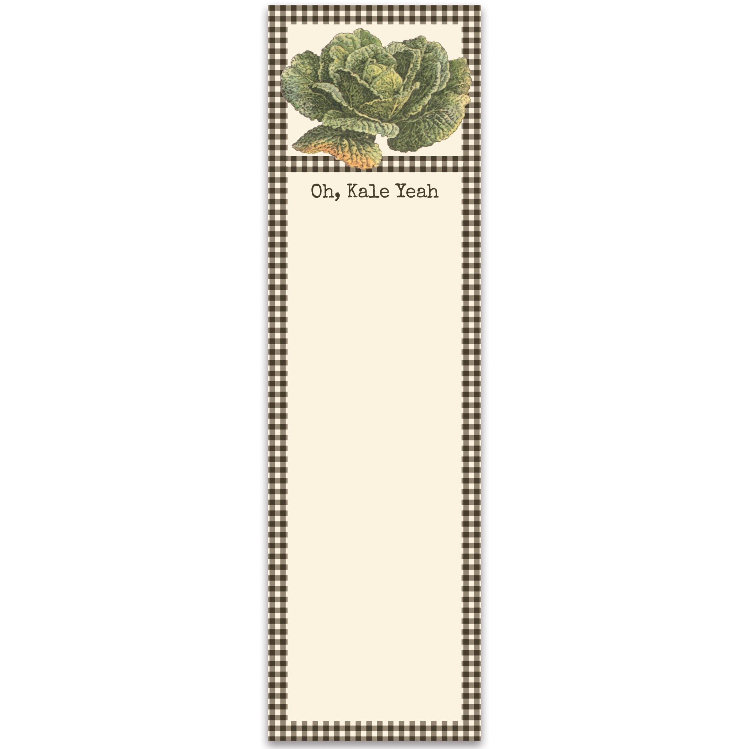 A list notepad from our Garden Collection displaying a vintage design of kale and black gingham pattern around writing space with a fun garden-themed pun that reads "Oh, Kale Yeah." Our Oh, Kale list pad includes 60 pages and a strong magnet to easily hang on magnetic surface for display. Proudly made in the USA. A fun garden-themed accessory perfect for adding functional style to any space.