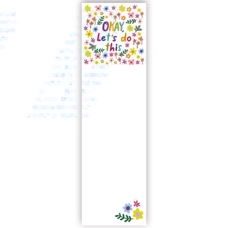 A list notepad from our Inspiration & Blooms Collection displaying a vibrant hand illustrated design of florals around a relatable inspirational sentiment that reads "Okay, Let's Do This" with blank space underneath for writing. Our Okay Let's Do This list pad includes 60 pages and a strong magnet to easily hang on magnetic surface for display. Proudly made in the USA. An inspirational gift perfect for adding functional style to any space.