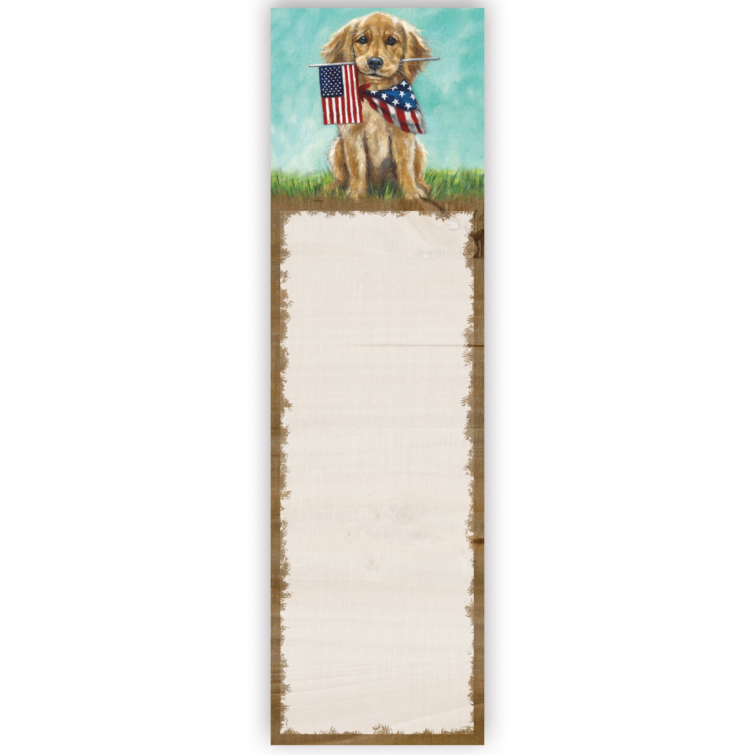 A list notepad from our Patriotic Collection displaying a golden retriever puppy holding an American flag in its mouth with a decorative space underneath for writing. Patriotic puppy design is replicated from original artwork painted onto burlap canvas, giving the art a unique depth and texture. Our Patriotic Pup list pad includes 60 pages and a strong magnet to easily hang on magnetic surface for display. Proudly made in the USA. A patriotic gift perfect for adding functional style to any space.