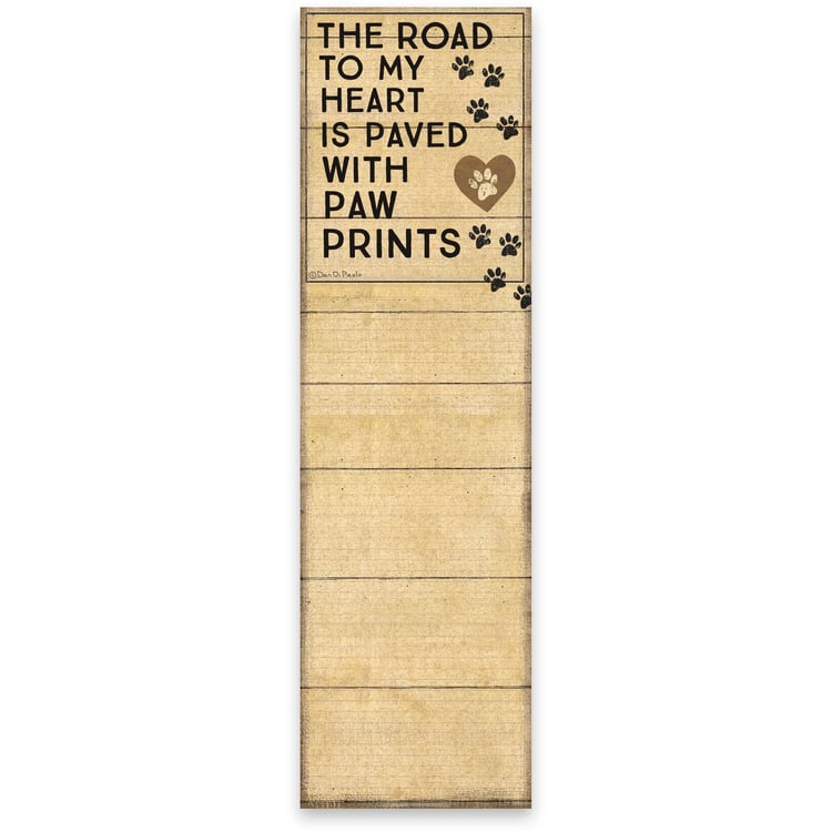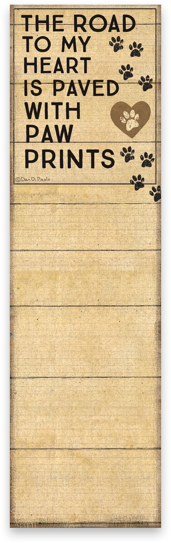 A list notepad displaying a rustic design of a fun pet inspired sentiment that reads "The Road To My Heart Is Paved With Paw Prints" on a slat wood background with space to write underneath. Our Paw Prints list pad includes 60 pages and a strong magnet to easily hang on magnetic surface for display. Proudly made in the USA. A rustic pet-themed gift perfect for adding functional style to any space.