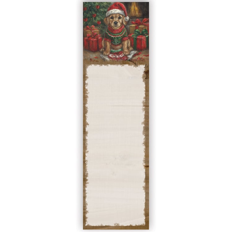 A list notepad from our Christmas Collection displaying a charming scene of a puppy wearing a Santa hat and holiday sweater getting into mischief by opening presents under a Christmas tree for a fun combination of a love for Christmas and pets. Christmas puppy design is replicated from original artwork painted onto burlap canvas, giving the art a unique depth and texture. Our Puppy Mischief list pad includes 60 pages and a strong magnet to easily hang on magnetic surface for display. Proudly made in the USA. A pet themed Christmas gift perfect for adding functional style to any space.