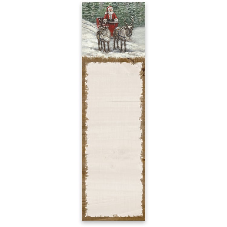 A list notepad from our Christmas Collection displaying a hand painted design of Santa in a sleigh with wood accents around writing space. Design is replicated from original artwork painted onto burlap canvas, giving the art a unique depth and texture. Includes 60 pages and a strong magnet to easily display on magnetic surface. Our Santa's Sleigh list pad is proudly made in the USA. A charming seasonal accessory perfect for any space.