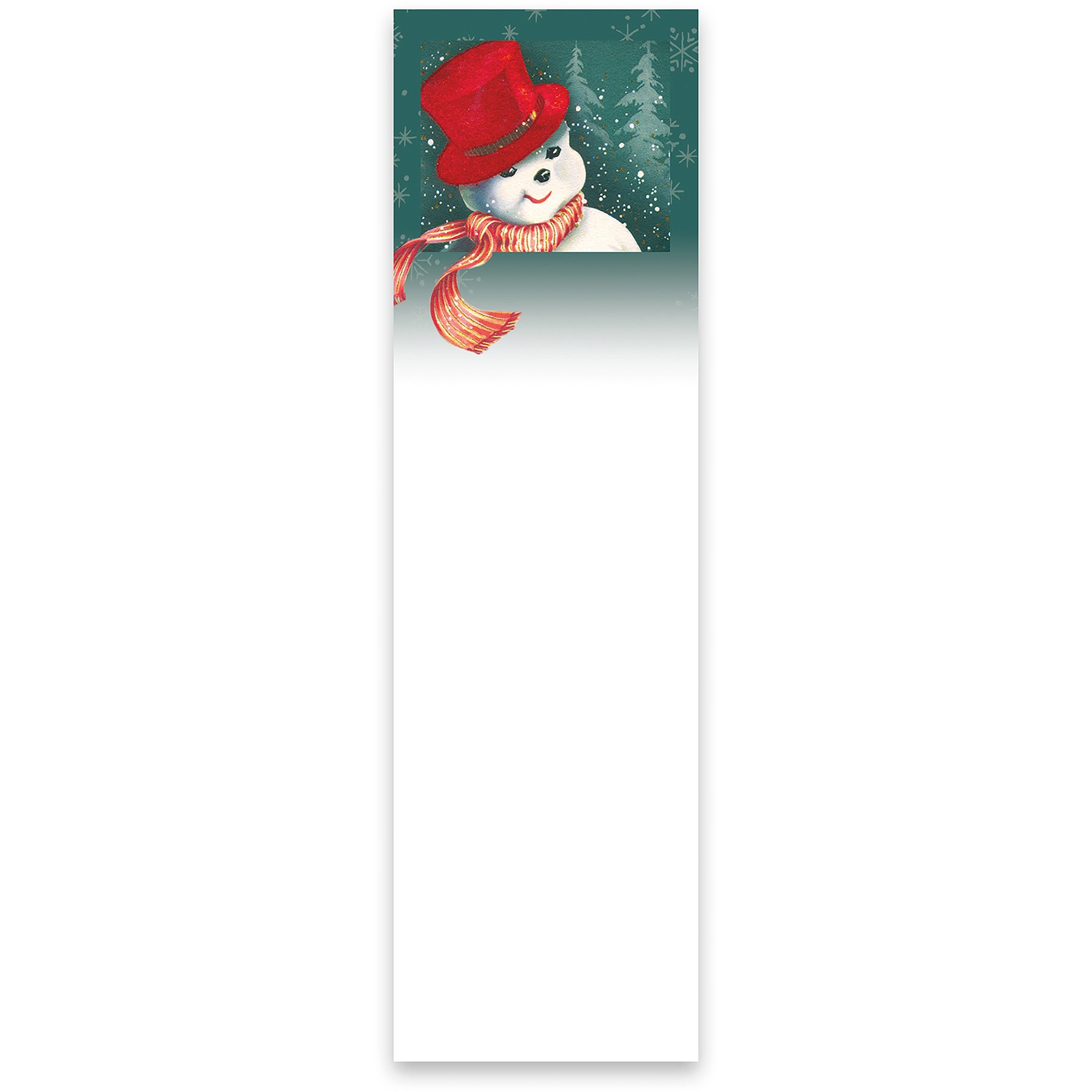 A list notepad from our Christmas Collection displaying vintage art of a jolly snowman wearing a red scarf and top hat with space to write underneath. Includes 60 pages and a strong magnet to easily display on magnetic surface. Our Snowman In A Red Hat list pad is proudly made in the USA. A charming seasonal accessory perfect for any space.