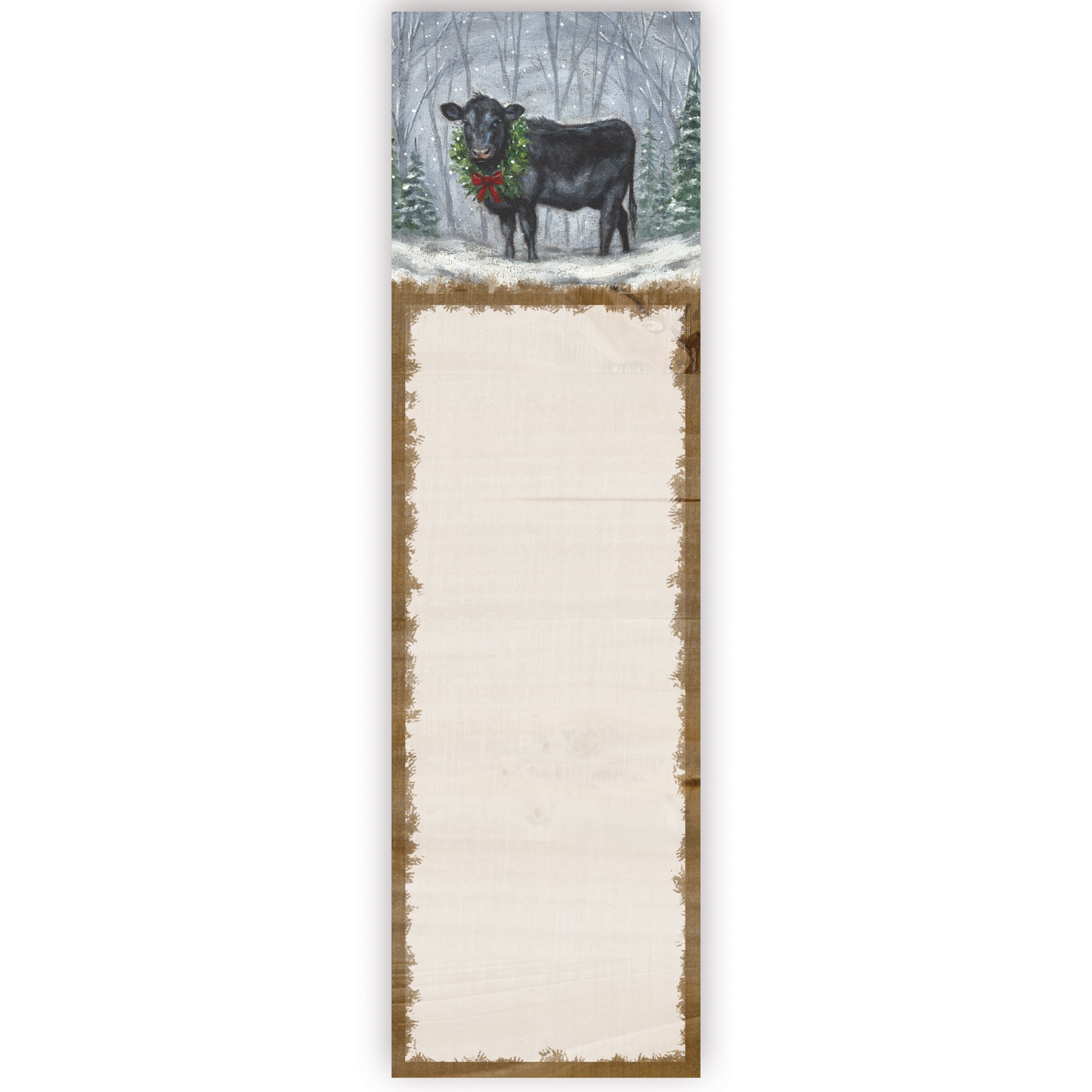 A list notepad from our Christmas Collection displaying a winter scene of an angus cow wearing a holiday wreath with a decorative space underneath for writing. Winter cow design is replicated from original artwork painted onto burlap canvas, giving the art a unique depth and texture. Our Snowy Angus list pad includes 60 pages and a strong magnet to easily hang on magnetic surface for display. Proudly made in the USA. A farm themed Christmas gift perfect for adding functional style to any space.