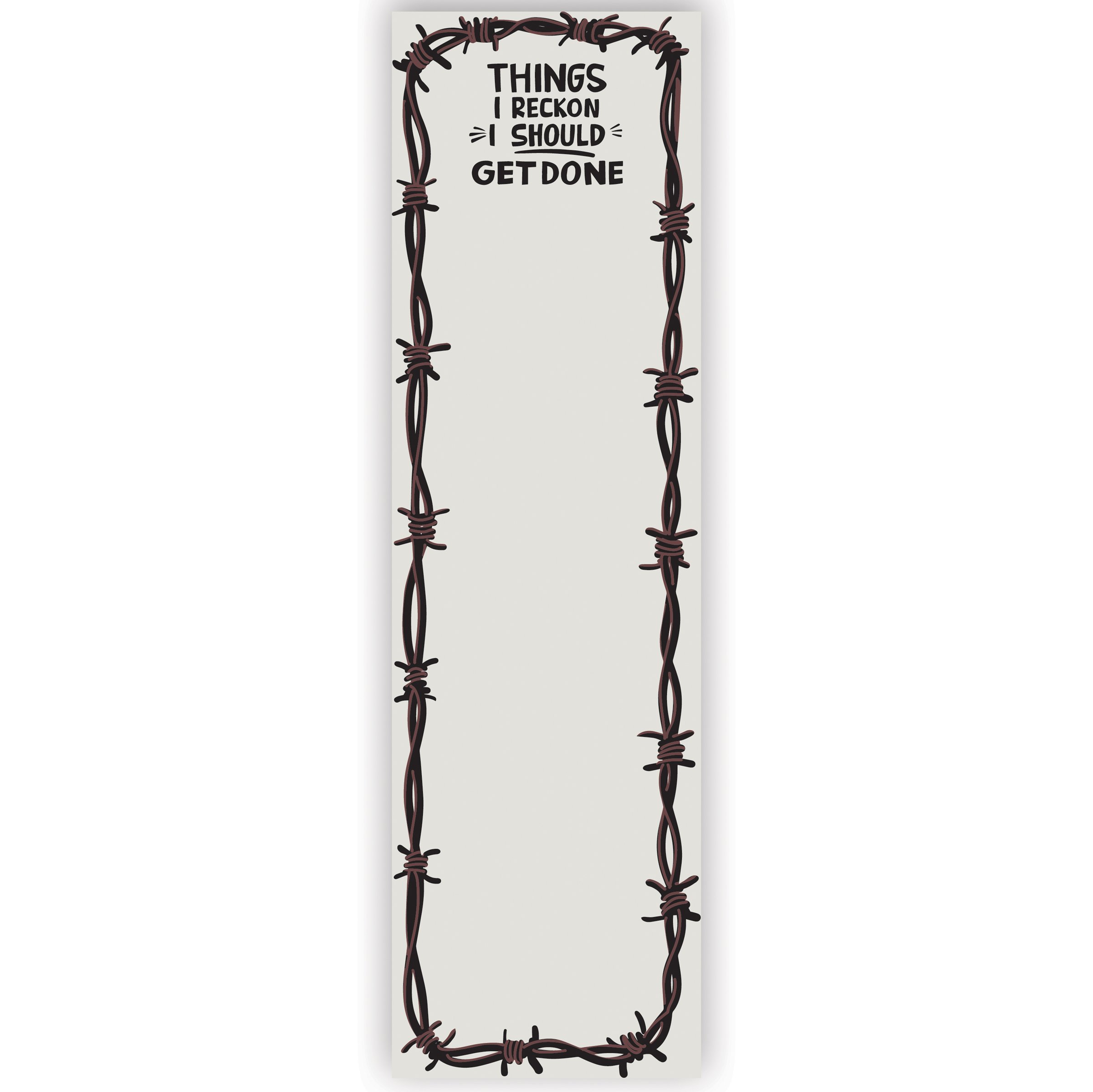 A list notepad from our Western Collection displaying a playful hand illustrated design of barbed wire around a fun western inspired sentiment that reads "Things I Reckon I Should Get Done" and a blank space for writing. Our Things I Reckon I Should Get Done list pad includes 60 pages and a strong magnet to easily hang on magnetic surface for display. Proudly made in the USA. A fun western-themed gift perfect for adding functional style to any space.