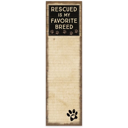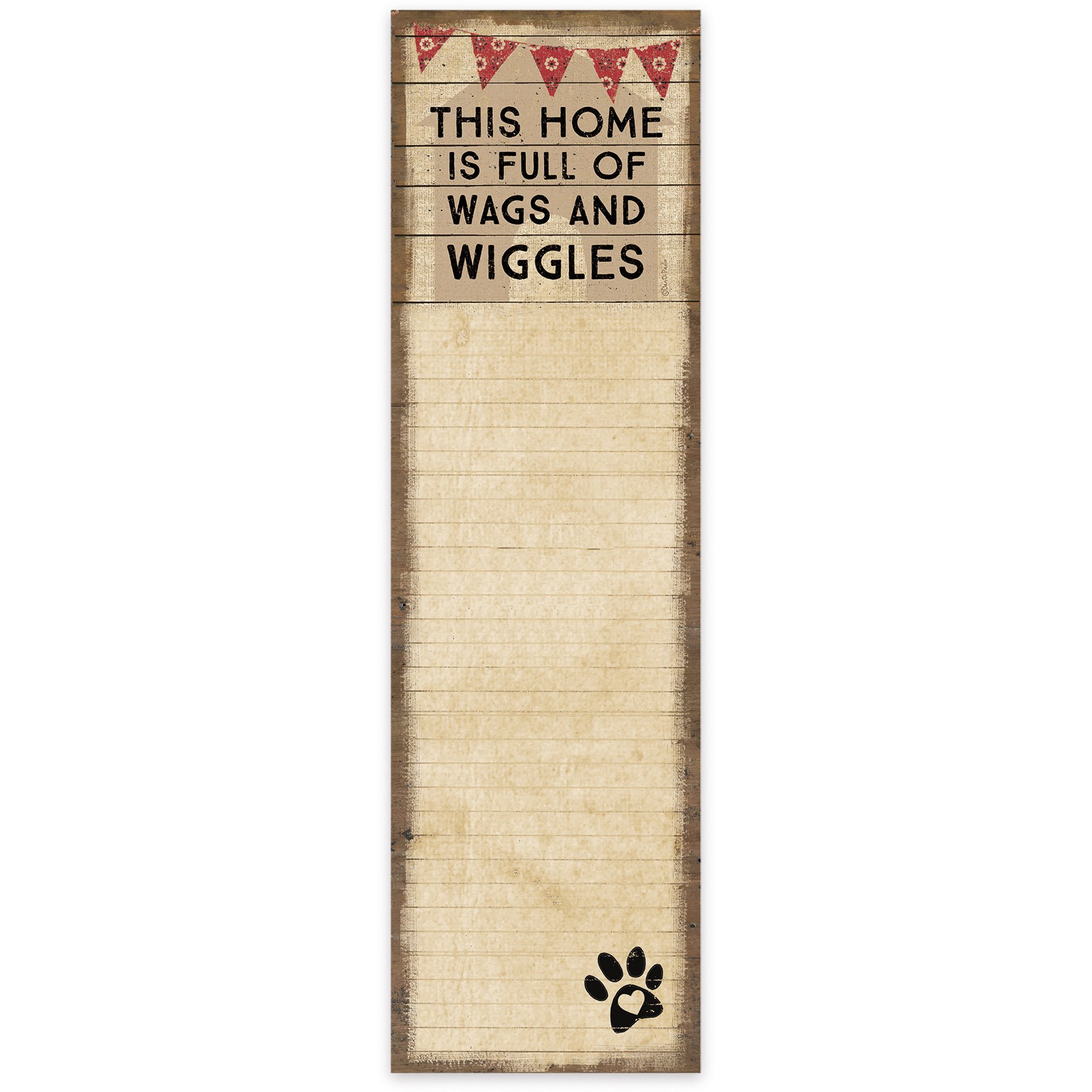 A list notepad displaying a rustic design of a fun dog inspired sentiment that reads "This Home Is Full Of Wags And Wiggles" on a slat wood background with lined space to write underneath. Our Wags And Wiggles list pad includes 60 pages and a strong magnet to easily hang on magnetic surface for display. Proudly made in the USA. A rustic pet-themed gift perfect for adding functional style to any space.