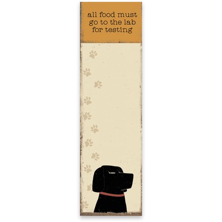 A list notepad from our Pet Collection displaying a rustic pet-themed design featuring a sassy dog and humorous "All Food Must Go To The Lab For Testing" sentiment. Includes 60 pages and a strong magnet to easily display on magnetic surface. Our To The Lab For Testing list pad is proudly made in the USA. A charming everyday accessory perfect for any kitchen space.