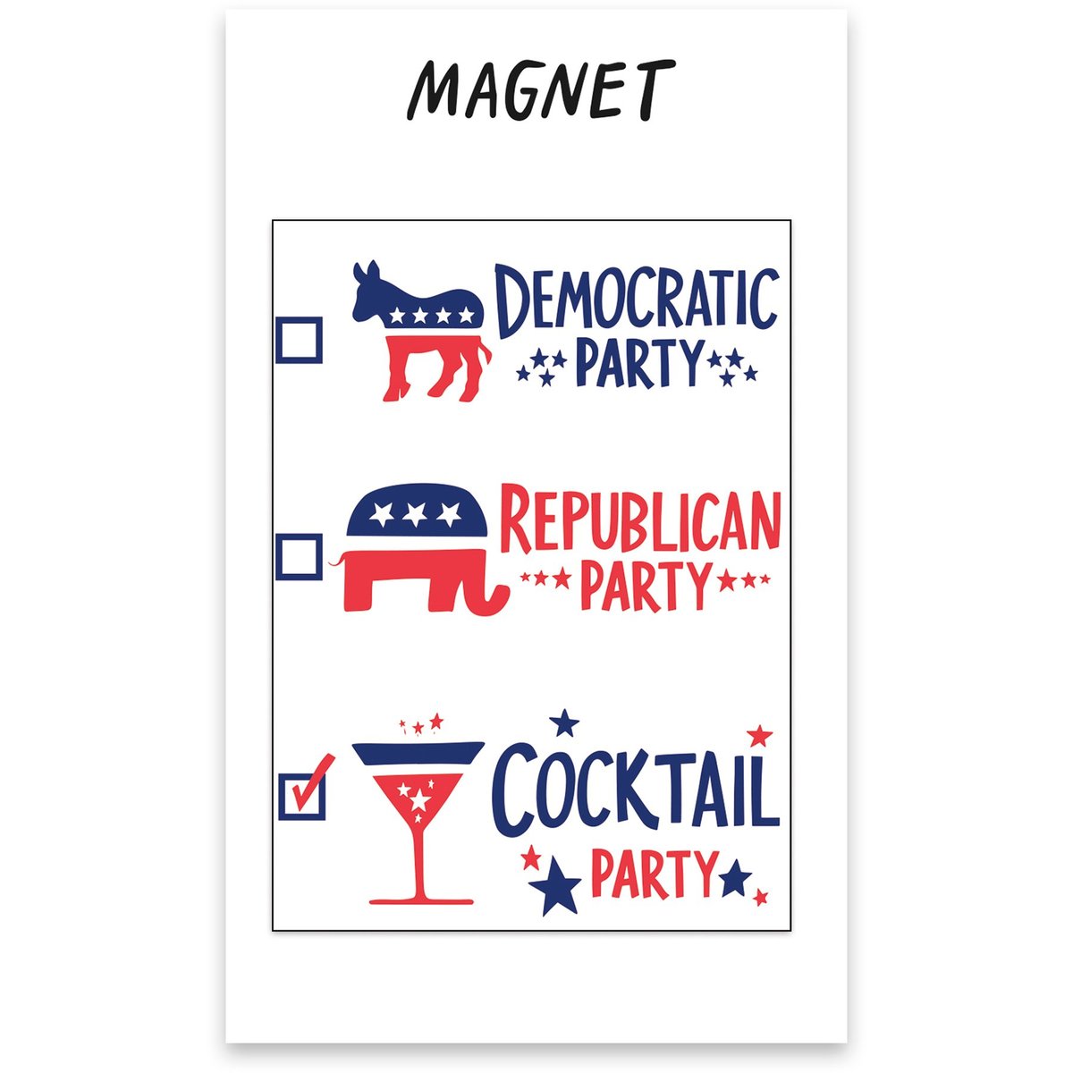 A magnet featuring a check list design and "Democratic Party Republican Party Cocktail Party" sentiment on a white palette. Magnet is waterproof, UV protected, and ultra-strong.