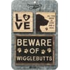 A set of three wooden magnets displaying individual dog inspired designs in a rustic style with lovely dog-themed sentiments that read "Love - All You Need Is Love And A Dog - Beware Of Wigglebutts." Our Dog magnet set is placed on a sturdy galvanized metal card and packaged in a poly bag making it great for gifting with a hole in the card for easy store rack display. A gift set of rustic pet-themed home accents with a variety of display options.