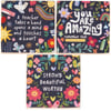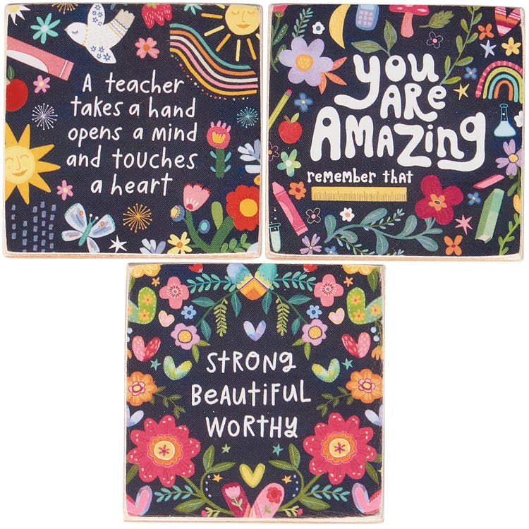 A set of three wooden magnets from our Teacher Collection displaying vibrant hand illustrated designs of flowers, birds, and classroom objects surrounding inspirational teacher-themed sentiments on each. Sentiments read "A Teacher Takes A Hand Opens A Mind And Touches A Heart," "You Are Amazing - Remember That," and "Strong Beautiful Worthy." Our Amazing magnet set is packaged on a galvanized metal card inside a poly bag for easy rack display and gifting. An inspirational teacher-themed gift perfect for everyday home or classroom display.