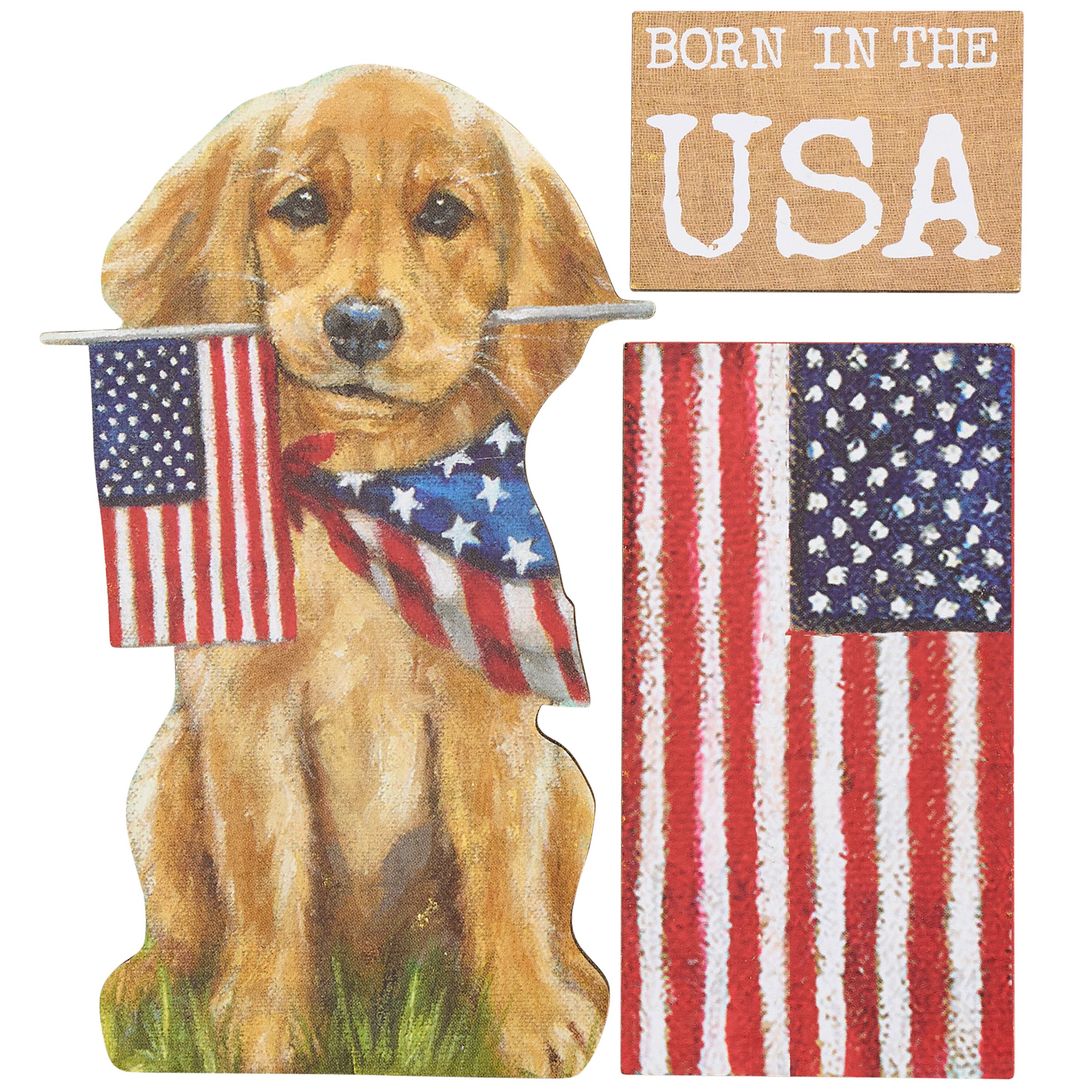 A set of 3 wooden magnets from our Patriotic Collection displaying rustic American flag inspired designs on each as well as a patriotic sentiment. Patriotic designs include an American flag, a patriotic golden retriever puppy, and a "Born In The USA" sentiment all replicated from original artwork painted onto burlap canvas, giving the art a unique depth and texture. Our Born In The USA magnet set is placed on a patriotic blue metal card and packaged in a poly bag making it great for gifting with a hole in the card for easy store rack display. A set of patriotic home accents perfect for 4th of July and Memorial Day decorating or celebrating stars and stripes all year round.