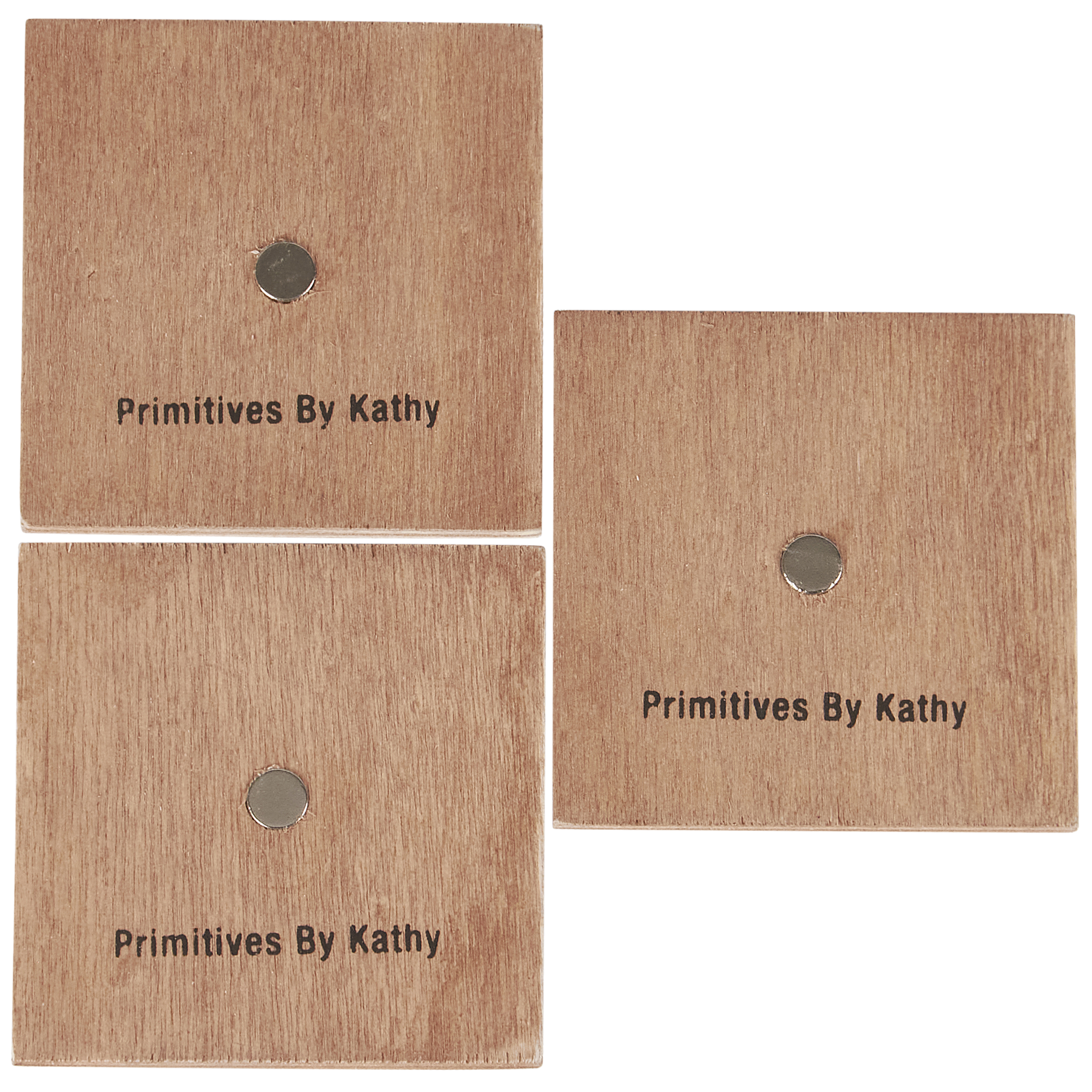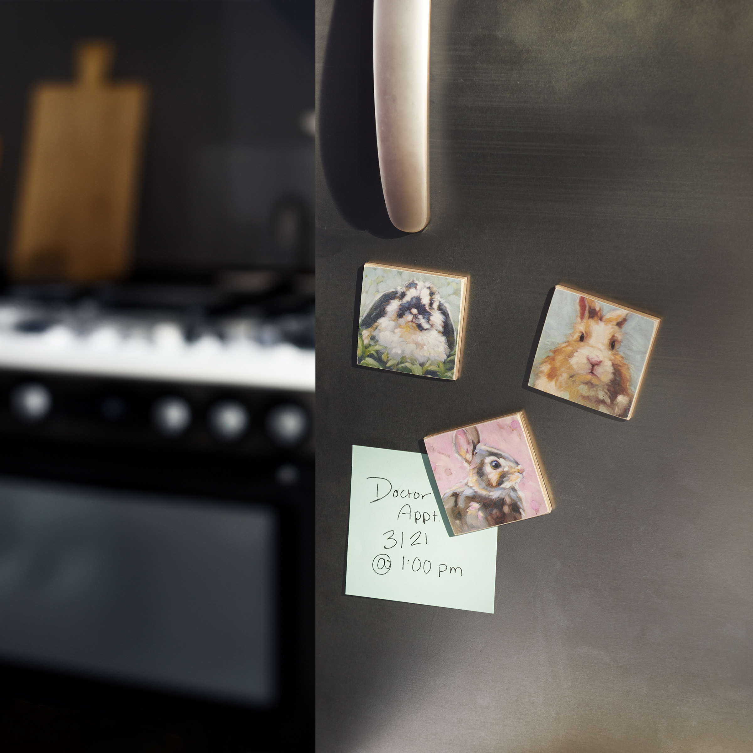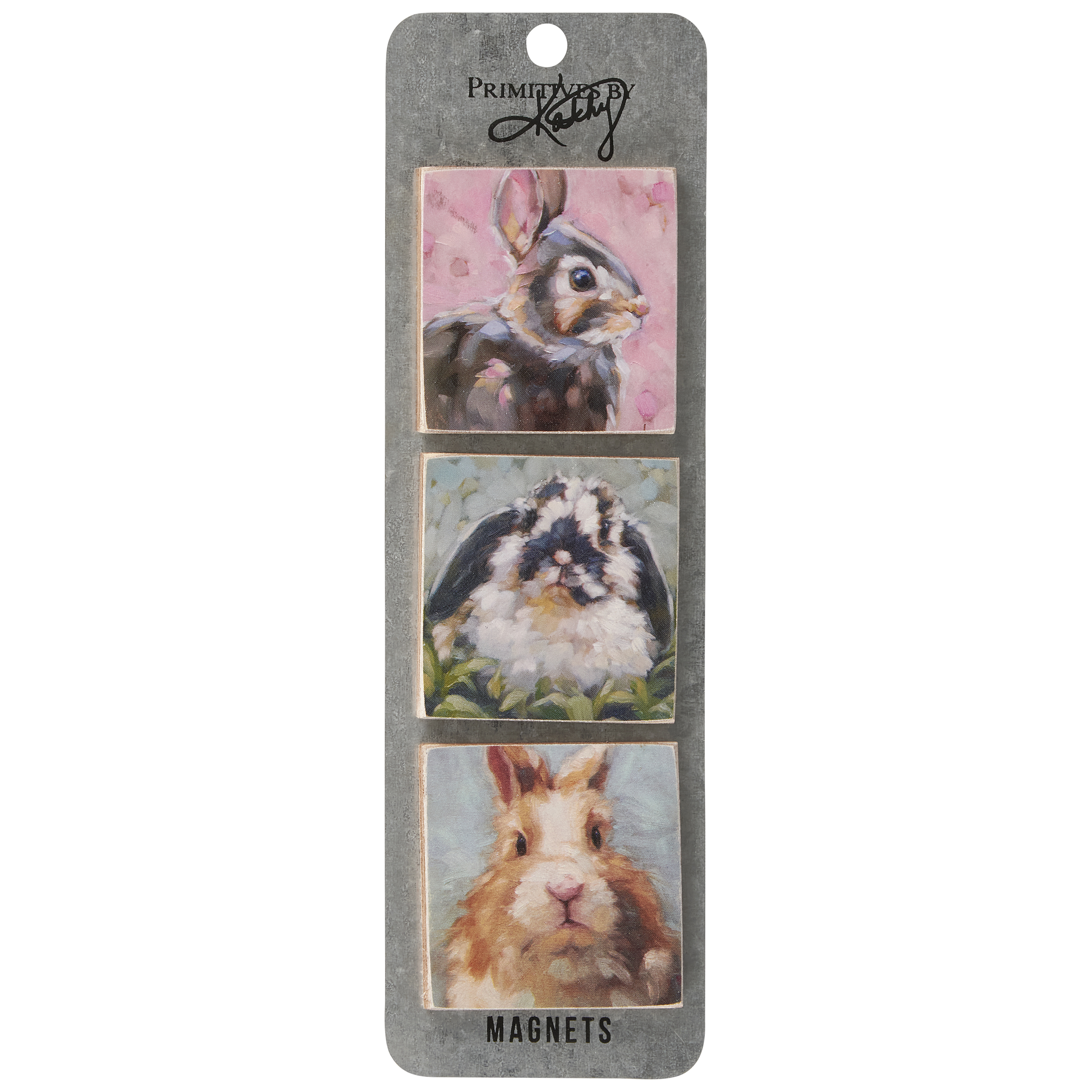 A set of 3 wooden magnets from our Easter & Spring Collection displaying charming scenes of various bunnies on each magnet with distressed details for a rustic touch. Designs are replicated from original artwork hand painted in a unique textured style. Our Bunny magnet set is packaged on a galvanized metal card and in poly bag for easy store display and gifting. A gift set of spring-themed home accents with a variety of display options.