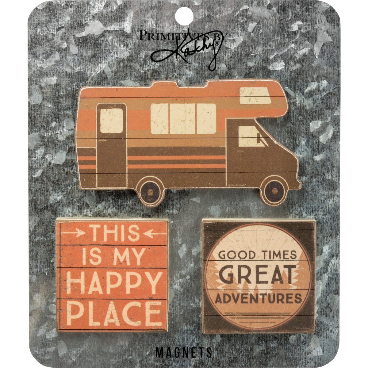 A set of three camping-inspired wooden magnets from our Lake & Cabin Collection featuring one RV magnet, one "This is My Happy Place" sentiment magnet, and one "Good Times - Great Adventures" sentiment magnet. Our Camping magnet set is displayed on a galvanized metal card and packaged in poly bag for easy display and gifting.