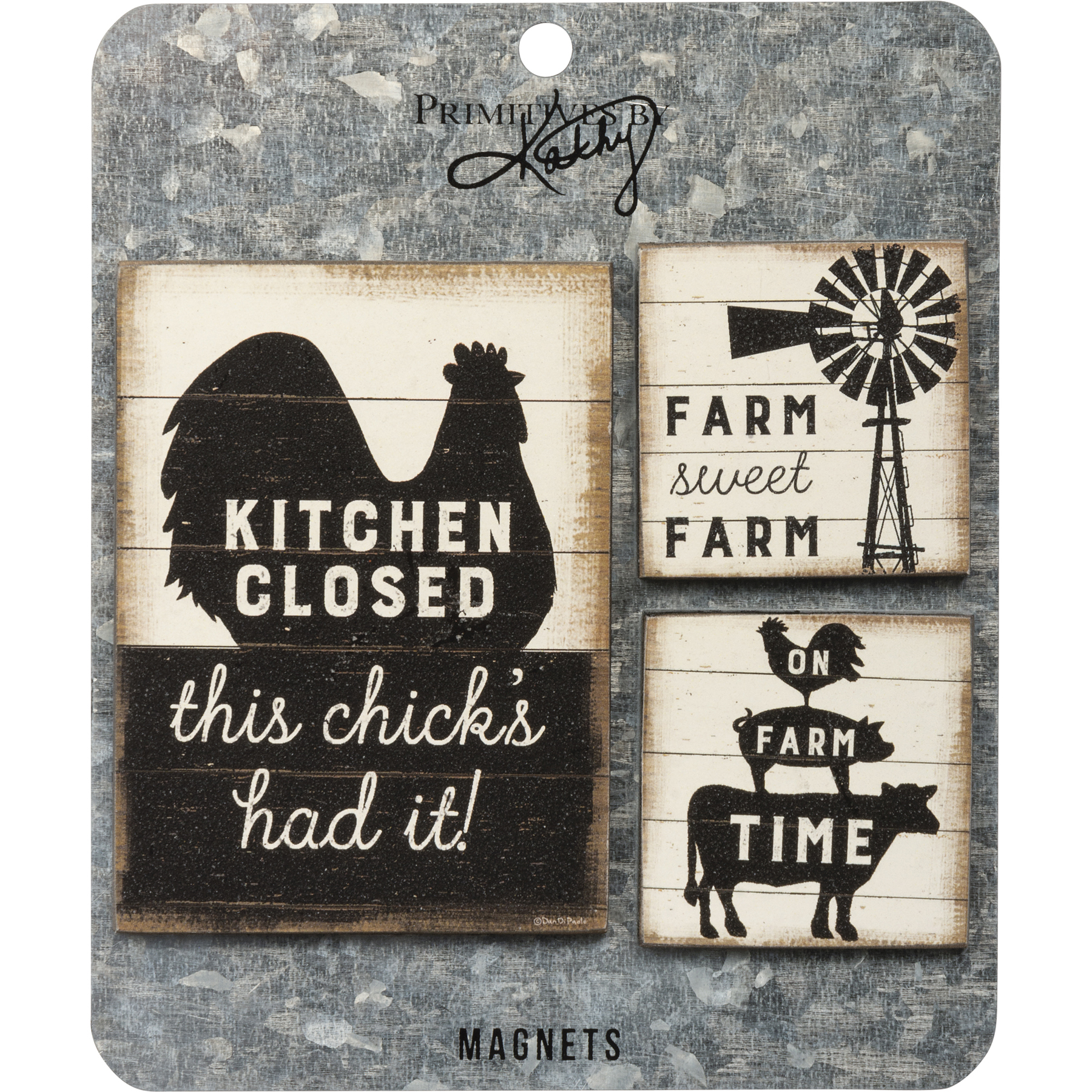 A set of three wooden magnets featuring rustic slat wood background designs and farm icons with "Kitchen Closed This Chick's Had It!", "Farm Sweet Farm," and "On Farm Time" sentiments. Magnets come attached to galvanized metal card for easy hanging on display.