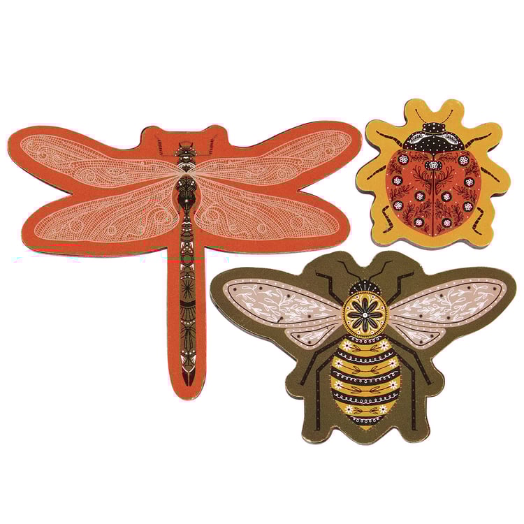 A set of 3 wooden magnets from our Garden Collection cut in the shape of the displayed garden bug designs on each including a dragonfly, ladybug, and honey bee featuring floral details in their designs. Each garden bug design is replicated from original artwork hand illustrated in an intricate style. Our Garden Bug magnet set is packaged on a galvanized metal card and in poly bag for easy rack display and gifting. A set of garden-themed home accents with a variety of display options.