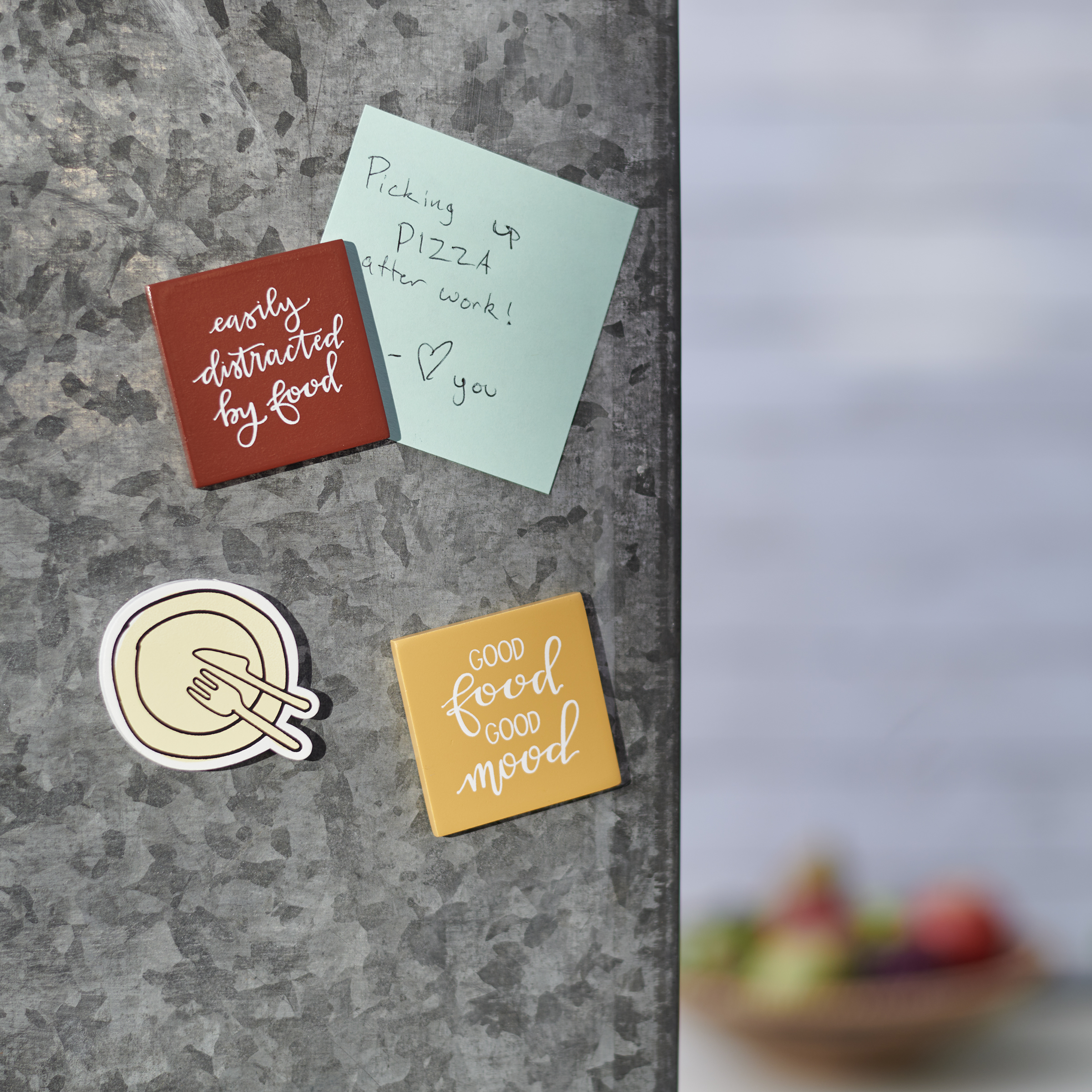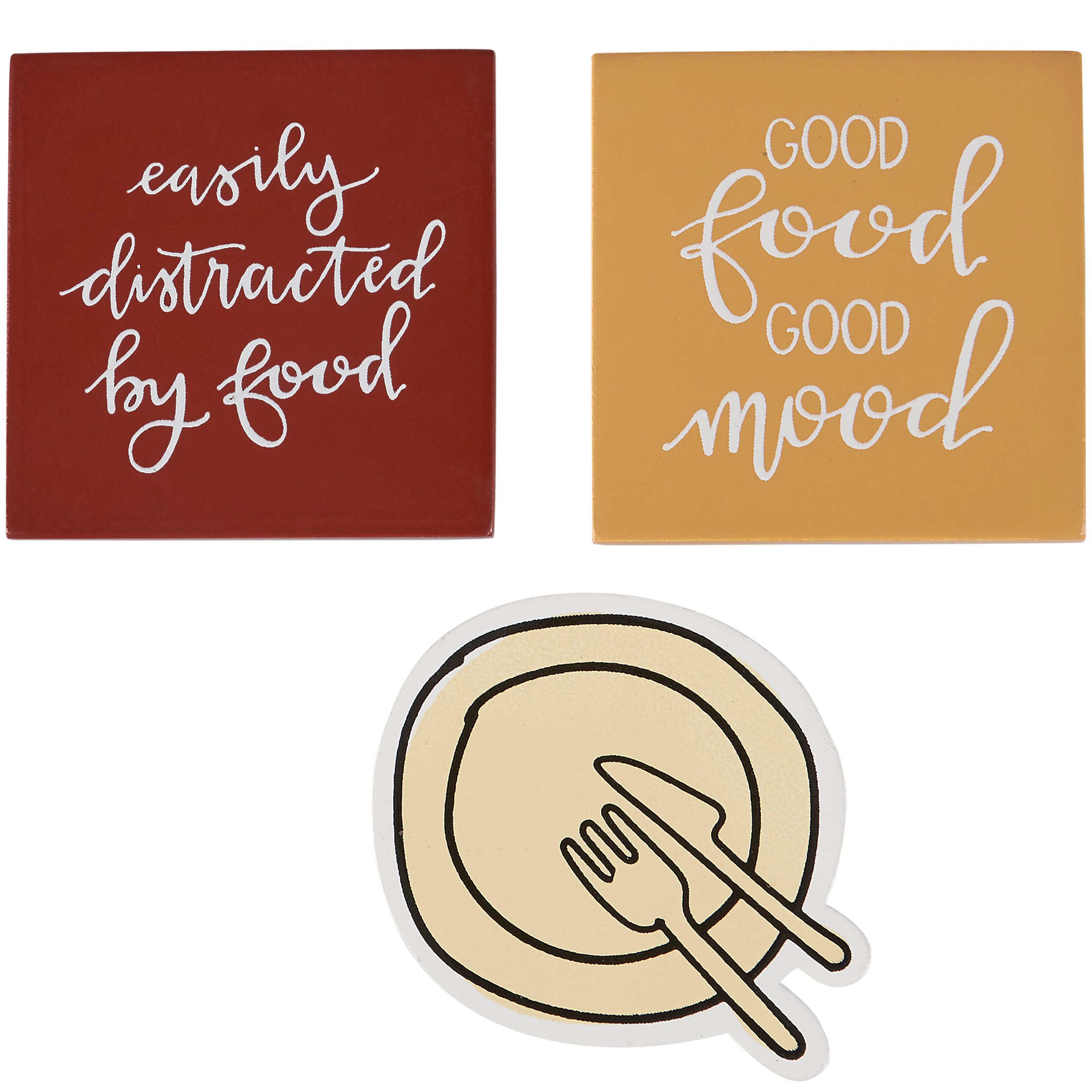 A set of three wooden magnets from our Foodie Collection displaying food-themed designs and sentiments. Designs include hand illustrated plate and utensils as well as a red square and yellow square with sentiments that read "Easily Distracted By Food" and "Good Food Good Mood." Our Good Food magnet set is packaged on a galvanized metal card inside a poly bag for easy rack display and gifting. A fun food-themed gift perfect for an everyday home accent.