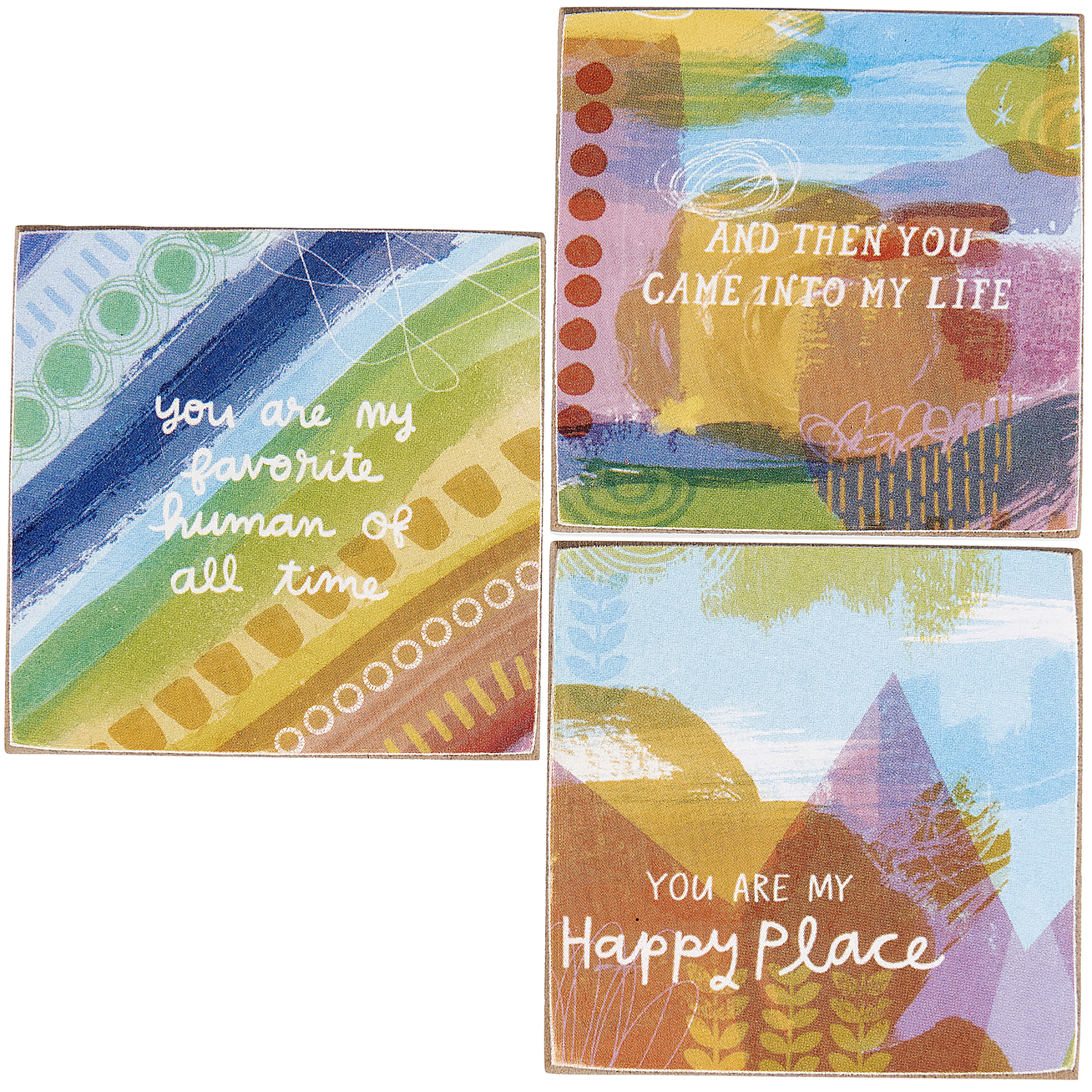 A set of three wooden magnets from our Inspiration & Blooms Collection displaying hand illustrated abstract designs in a warm color palette behind heartwarming love-themed sentiments on each. Sentiments read "And Then You Came Into My Life," "You Are My Happy Place," and "You Are My Favorite Human Of All Time." Our Happy Place magnet set is packaged on a galvanized metal card inside a poly bag for easy rack display and gifting. A lovely gift perfect for an everyday home accent.