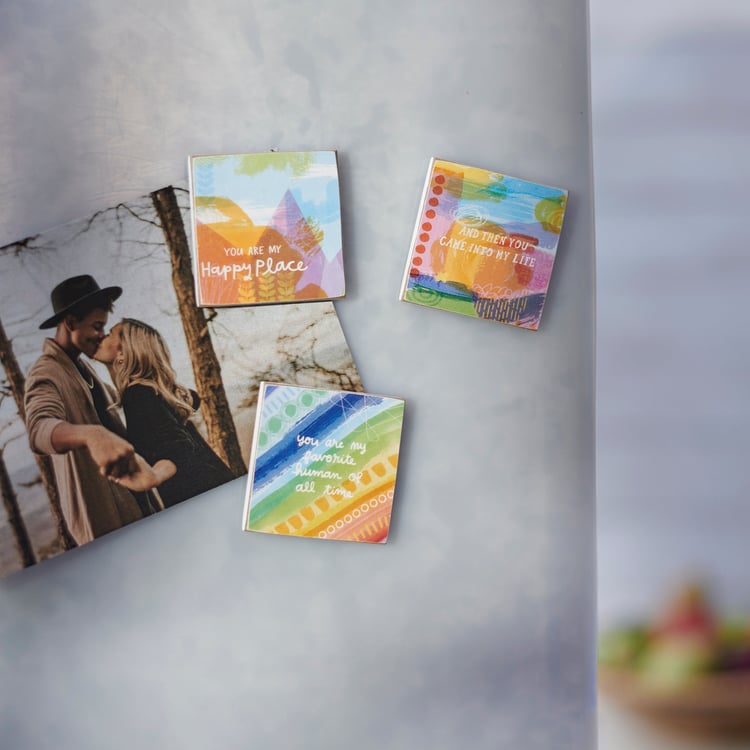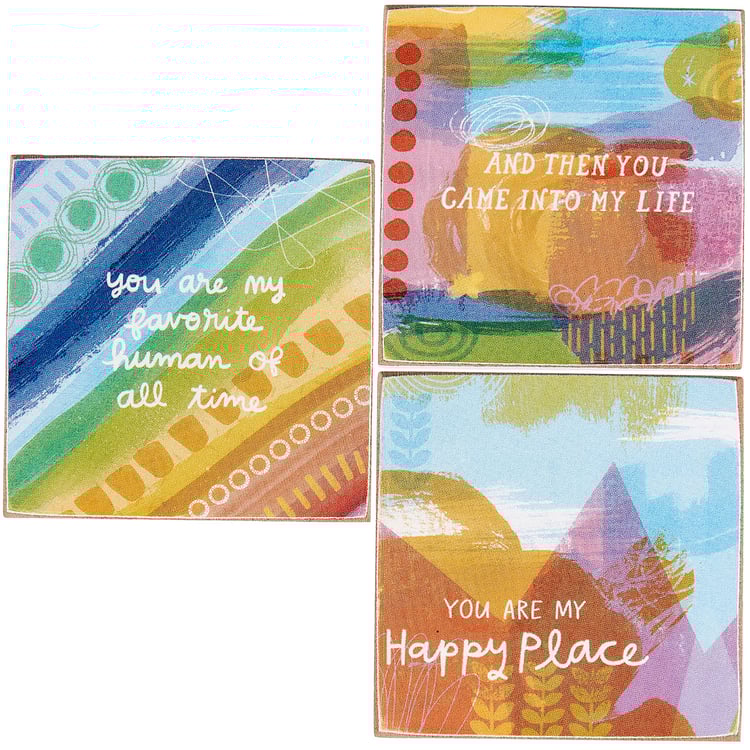 A set of three wooden magnets from our Inspiration & Blooms Collection displaying hand illustrated abstract designs in a warm color palette behind heartwarming love-themed sentiments on each. Sentiments read "And Then You Came Into My Life," "You Are My Happy Place," and "You Are My Favorite Human Of All Time." Our Happy Place magnet set is packaged on a galvanized metal card inside a poly bag for easy rack display and gifting. A lovely gift perfect for an everyday home accent.