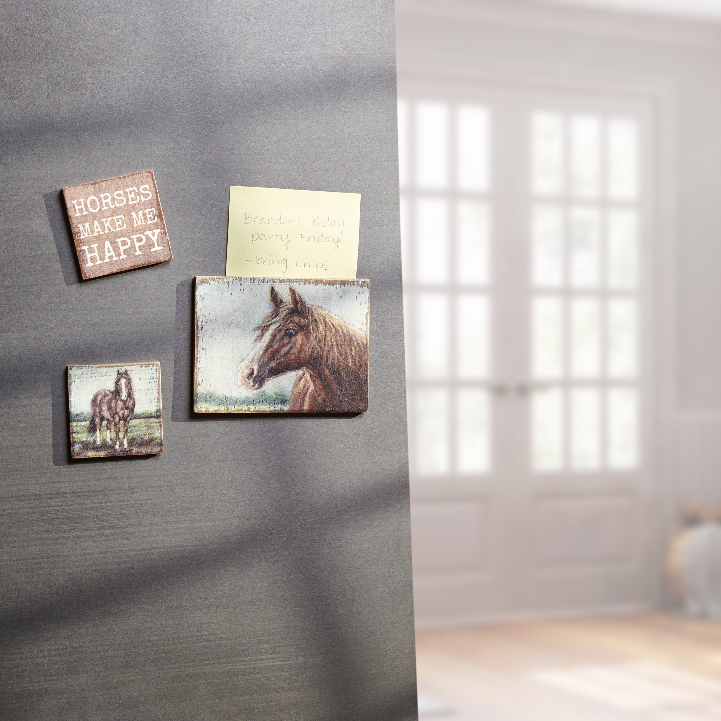 A set of three wooden magnets from our Farmhouse Collection displaying hand painted scenes of brown horses and one with a sentiment that reads "Horses Make Me Happy." Designs are replicated from original artwork painted onto burlap canvas, giving the art a unique depth and texture. Our Horse magnet set is packaged on a galvanized metal card and in poly bag for easy store display and gifting. A gift set of rustic farm-themed home accents with a variety of display options.