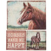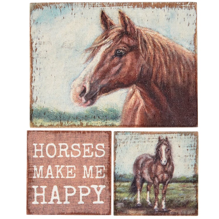 A set of three wooden magnets from our Farmhouse Collection displaying hand painted scenes of brown horses and one with a sentiment that reads "Horses Make Me Happy." Designs are replicated from original artwork painted onto burlap canvas, giving the art a unique depth and texture. Our Horse magnet set is packaged on a galvanized metal card and in poly bag for easy store display and gifting. A gift set of rustic farm-themed home accents with a variety of display options.