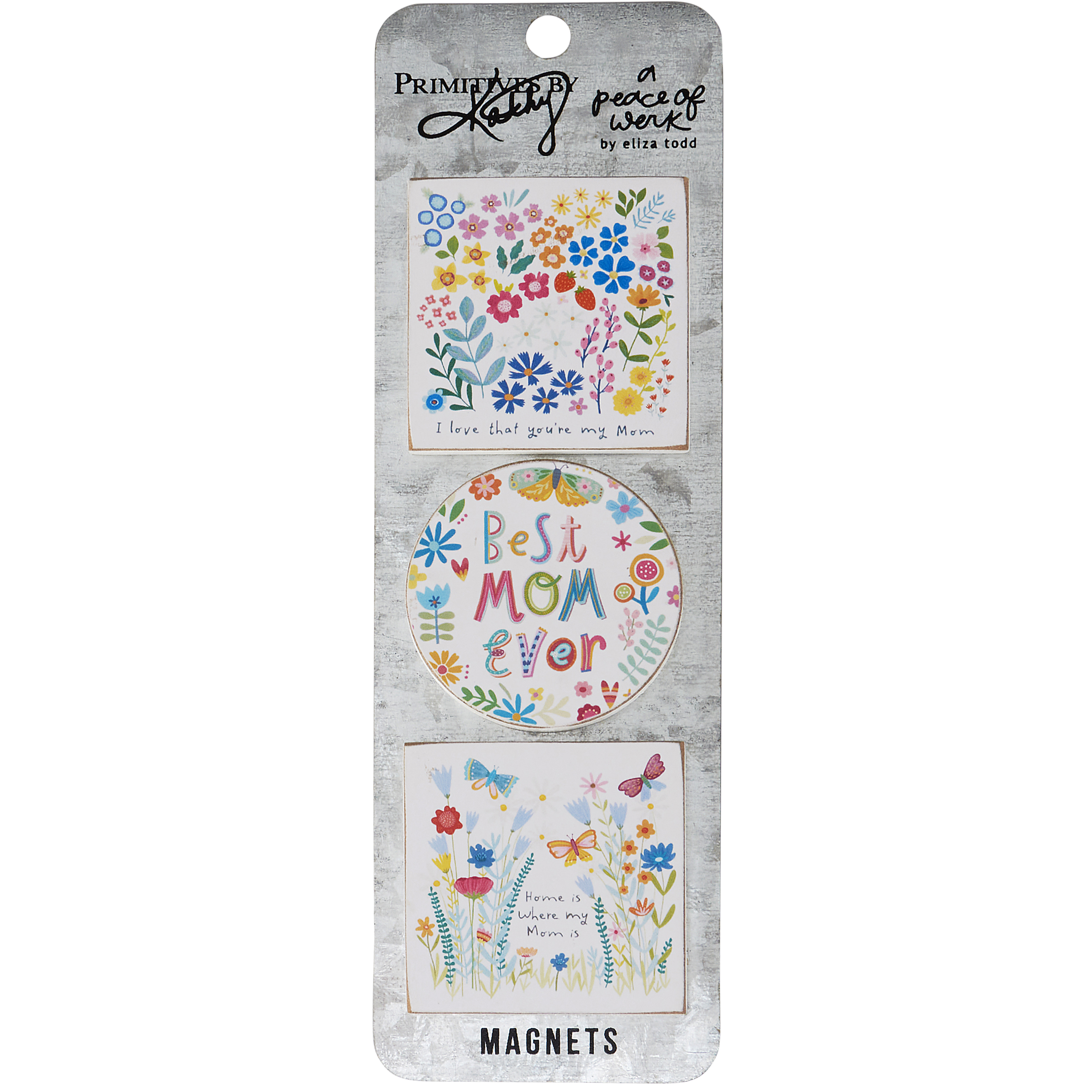 A set of three wooden magnets from our Mother's Day Collection displaying vibrant hand illustrated designs of flowers and nature surrounding heartwarming mom-themed sentiments on each. Sentiments read "I Love That You're My Mom," "Best Mom Ever," and "Home Is Where My Mom Is." Our My Mom magnet set is packaged on a galvanized metal card inside a poly bag for easy rack display and gifting. A lovely gift perfect for Mother's Day or as an everyday home accent.