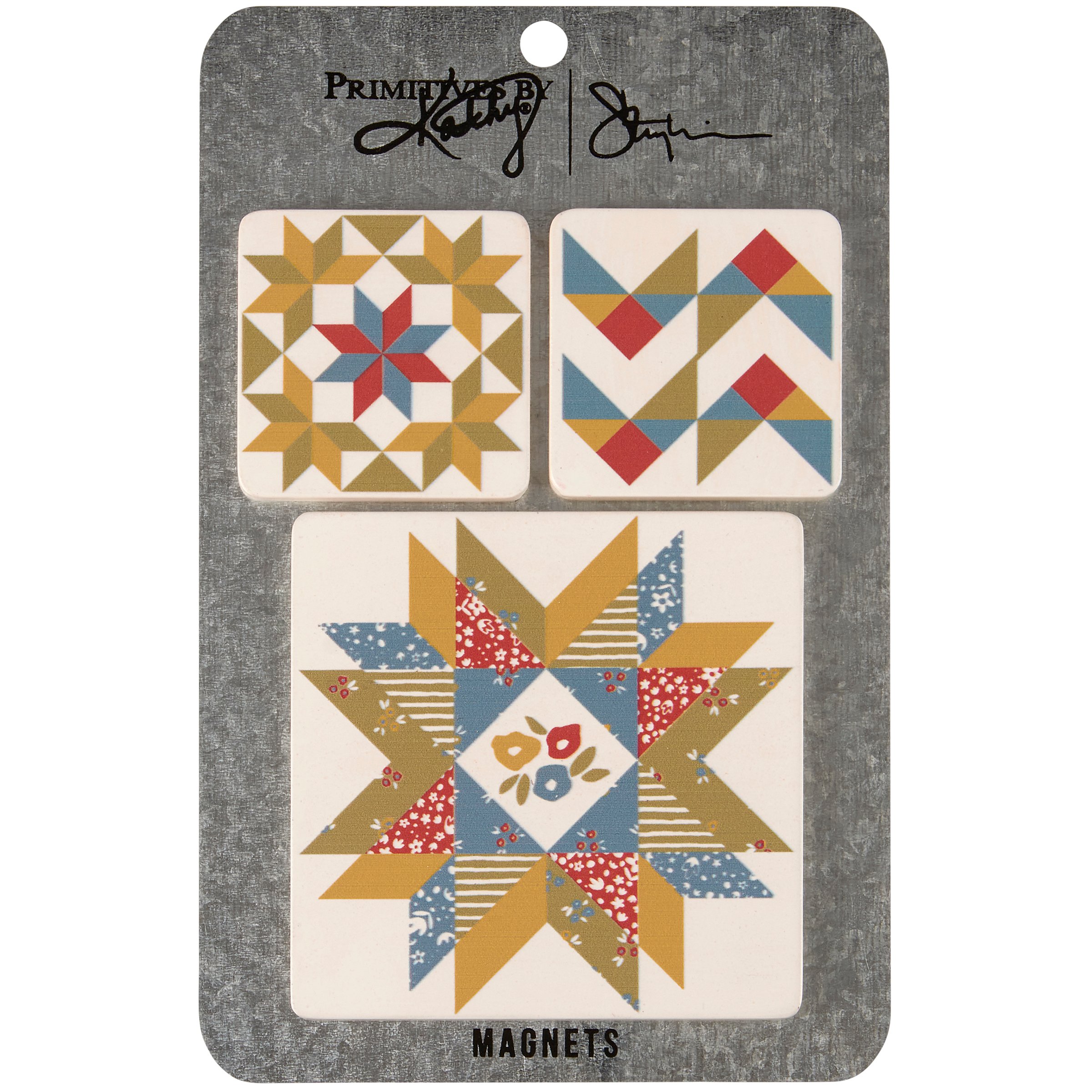 A set of three wooden magnets from our Folk Art Collection displaying various star quilt inspired patterns replicated from original hand illustrated art. Our Star Quilt magnet set is packaged on a galvanized metal card and in poly bag for easy store display and gifting. A gift set of rustic home accents with a variety of display options.