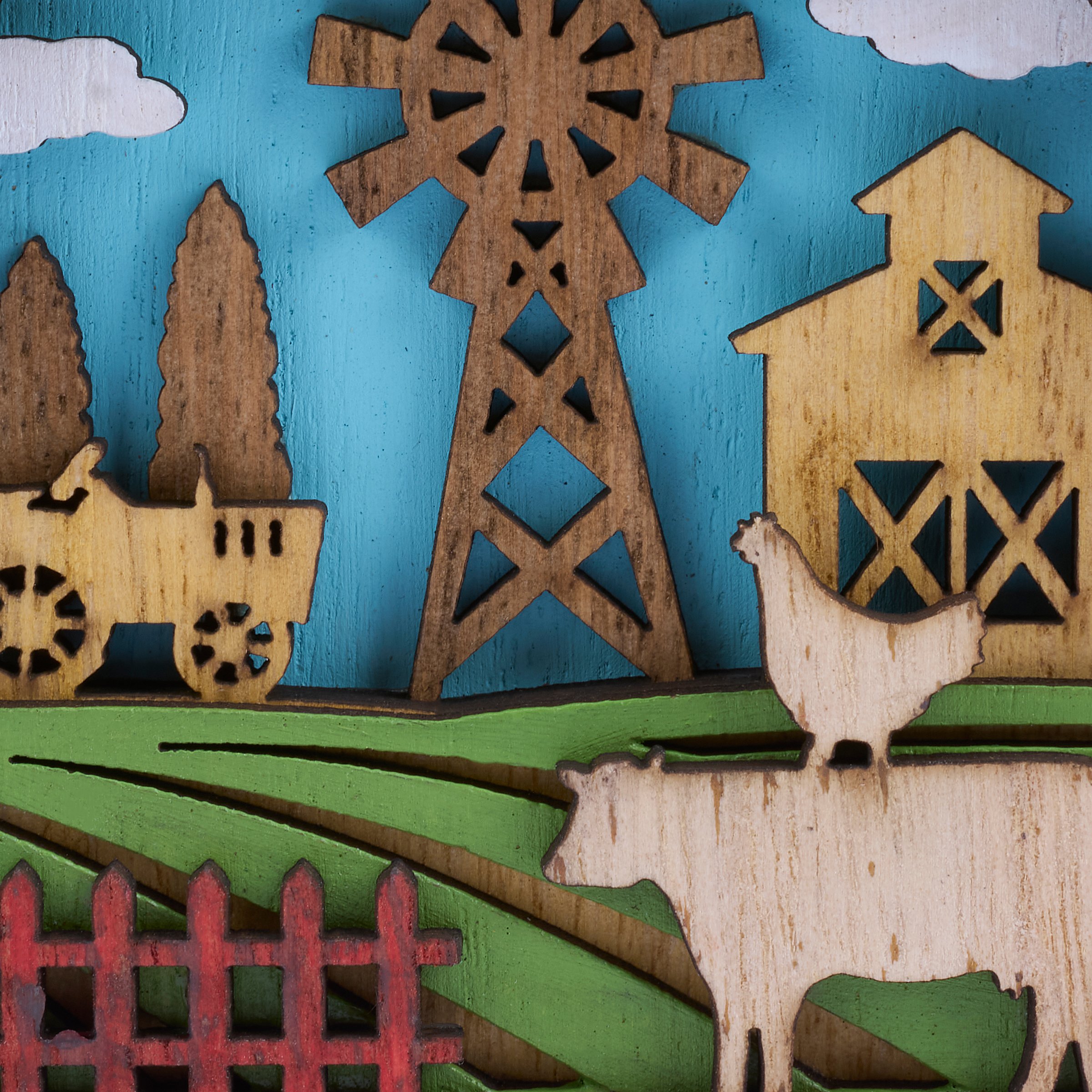 A wooden ornament from our Farmhouse Collection featuring a barn shape cut from natural wood with a farm scene displayed inside that is made with layered cutouts of colored wood pieces for added dimension. Our Barn magnetic ornament is ready to hang via the attached jute hanger with a magnet attached to the back for additional display options. A rustic home accent perfect for adding personality to a Christmas tree or for farm themed displays.