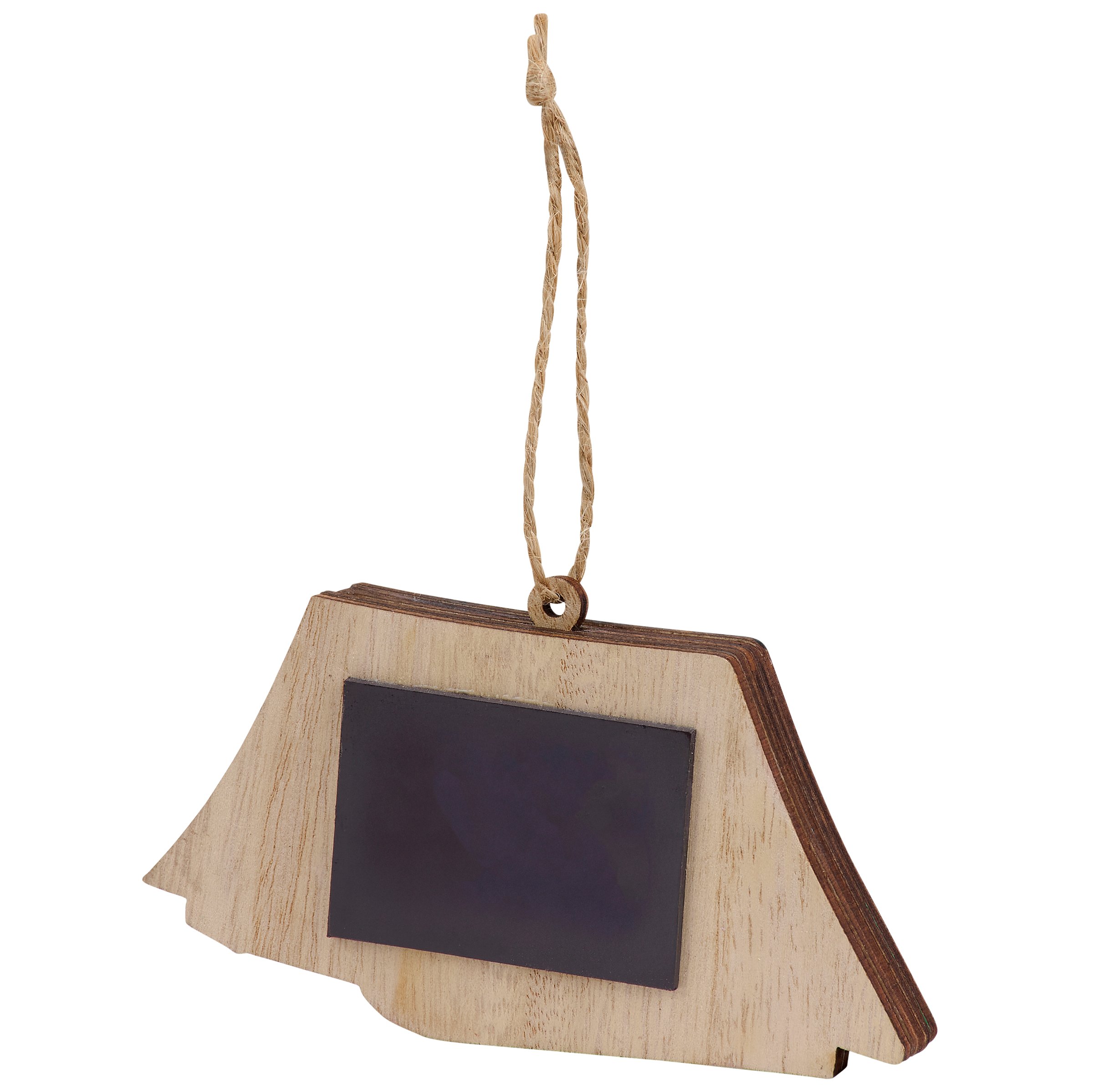 A wooden ornament from our Lake & Cabin Collection featuring a camping tent shape cut from natural wood with a cliff climbing scene displayed inside that is made with layered cutouts of colored wood pieces for added dimension. Our Camping Tent magnetic ornament is ready to hang via the attached jute hanger with a magnet attached to the back for additional display options. A rustic home accent perfect for adding personality to a Christmas tree or for nature themed displays.