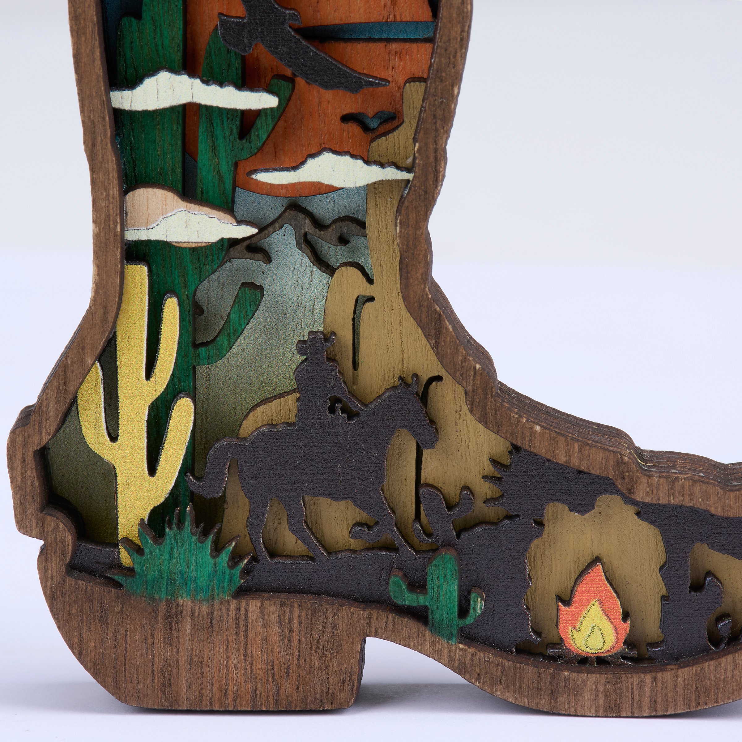 A wooden ornament from our Western Collection featuring a cowboy boot shape cut from natural wood with a desert campfire scene of a cowboy on a horse displayed inside that is made with layered cutouts of colored wood pieces for added dimension. Our Cowboy Boot magnetic ornament is ready to hang via the attached jute hanger with a magnet attached to the back for additional display options. A rustic home accent perfect for adding personality to a Christmas tree or for western themed displays.