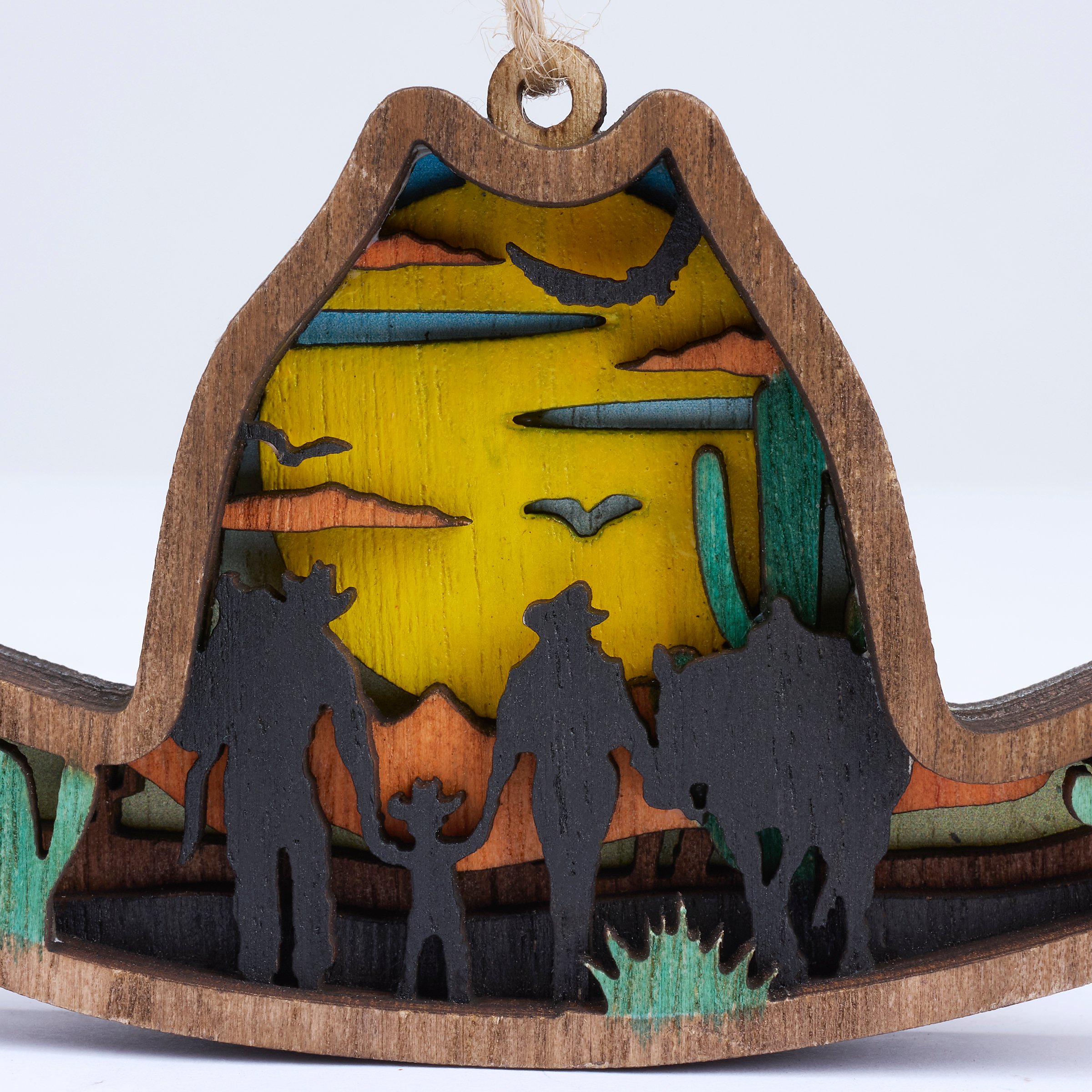A wooden ornament from our Western Collection featuring a cowboy hat shape cut from natural wood with a desert scene of a family displayed inside that is made with layered cutouts of colored wood pieces for added dimension. Our Cowboy Hat magnetic ornament is ready to hang via the attached jute hanger with a magnet attached to the back for additional display options. A rustic home accent perfect for adding personality to a Christmas tree or for western themed displays.