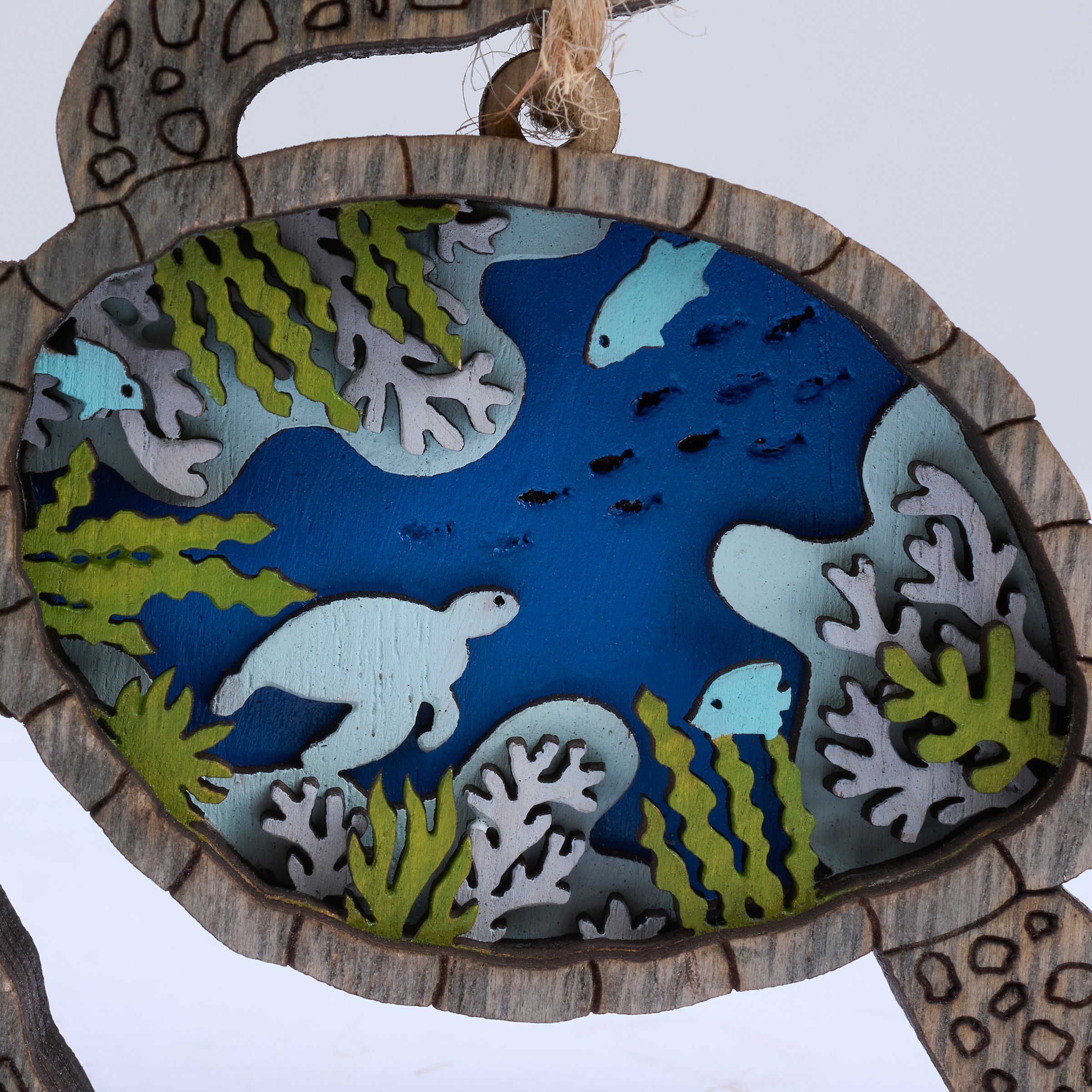 A wooden ornament from our Beach Collection featuring a sea turtle shape cut from natural wood with an ocean scene of turtles displayed inside that is made with layered cutouts of colored wood pieces for added dimension. Our Sea Turtle magnetic ornament is ready to hang via the attached jute hanger with a magnet attached to the back for additional display options. A rustic home accent perfect for adding personality to a Christmas tree or for beach themed displays.