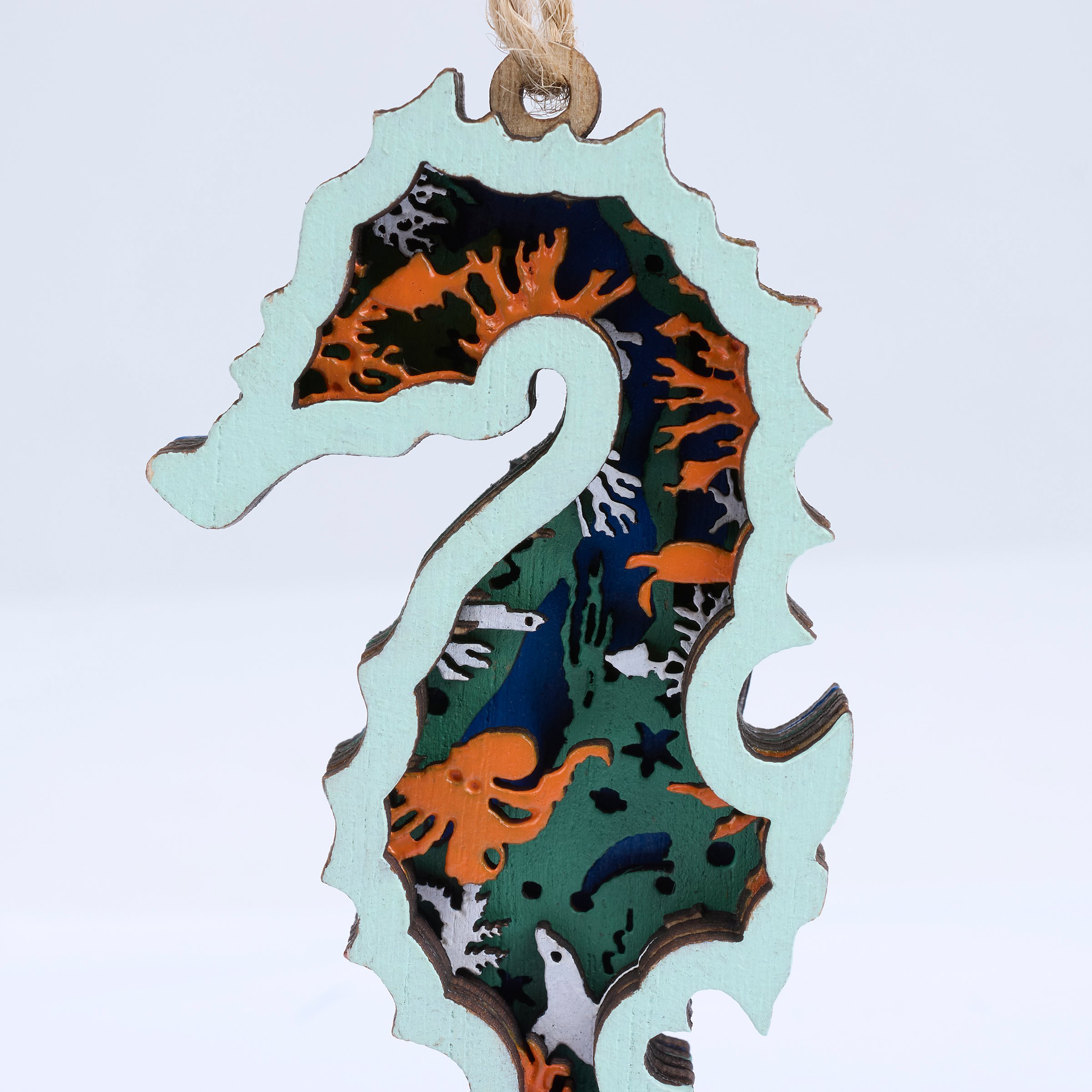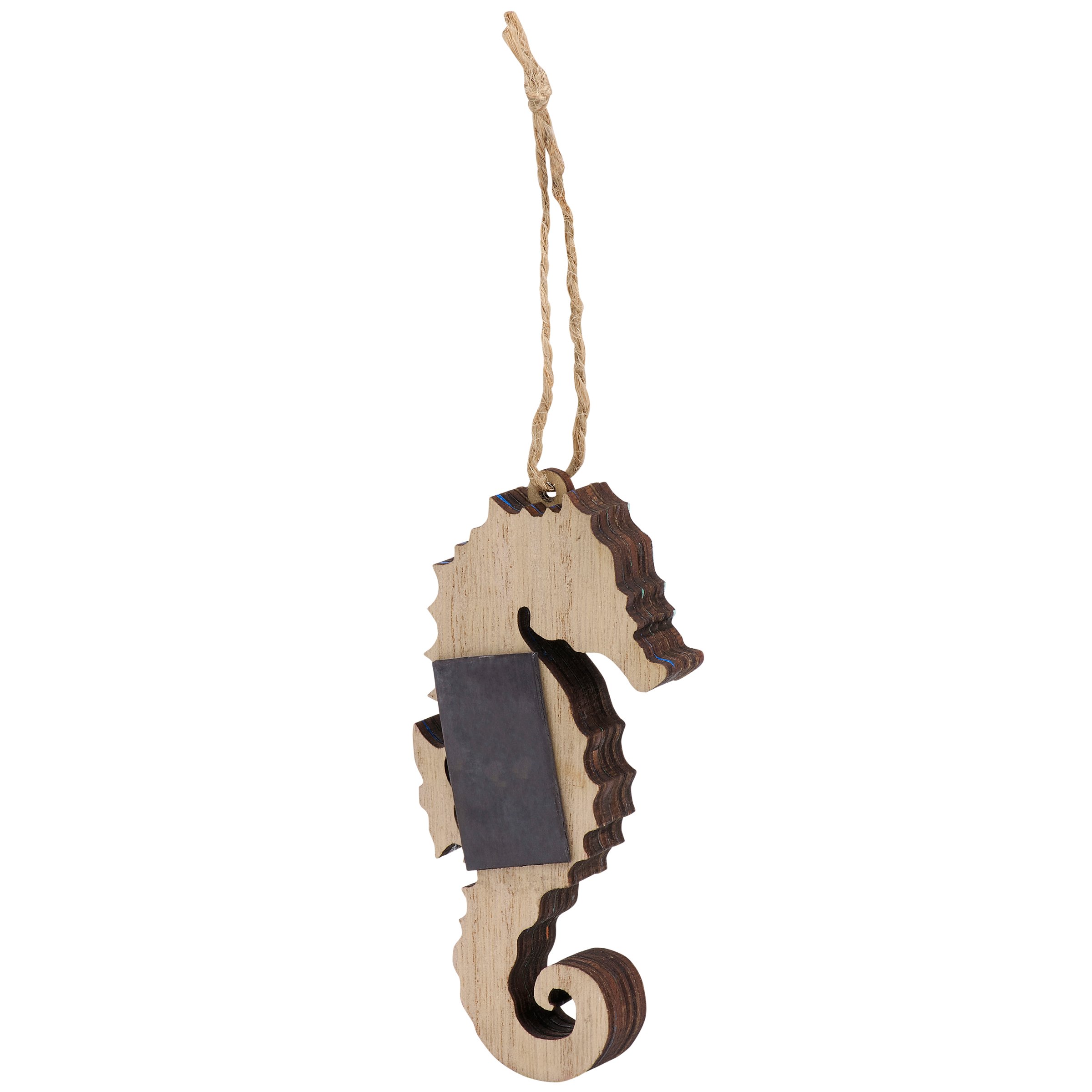 A wooden ornament from our Beach Collection featuring a seahorse shape cut from natural wood with an ocean scene of sea creatures displayed inside that is made with layered cutouts of colored wood pieces for added dimension. Our Seahorse magnetic ornament is ready to hang via the attached jute hanger with a magnet attached to the back for additional display options. A rustic home accent perfect for adding personality to a Christmas tree or for beach themed displays.