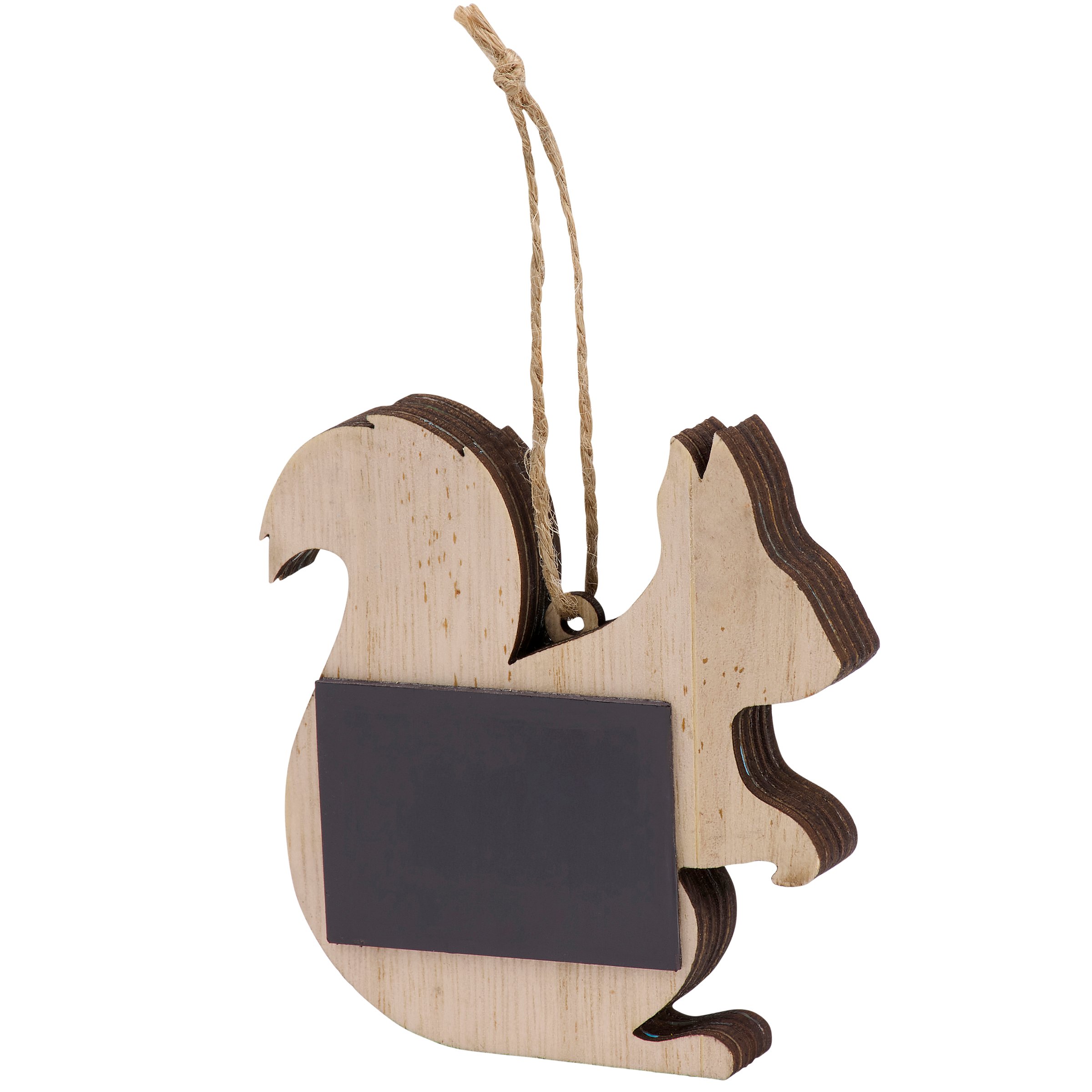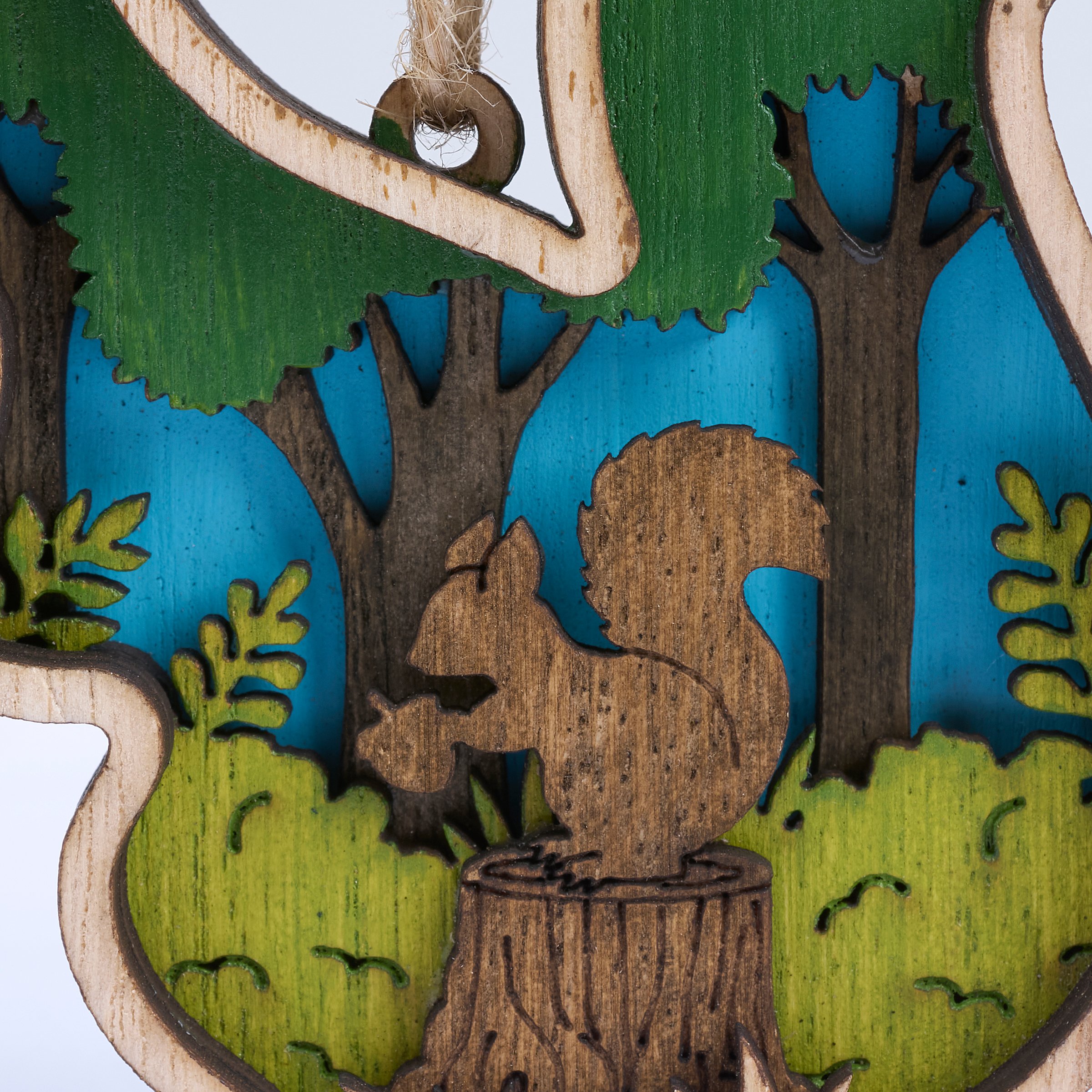 A wooden ornament from our Lake & Cabin Collection featuring a squirrel shape cut from natural wood with a forest scene of squirrel eating an acorn displayed inside that is made with layered cutouts of colored wood pieces for added dimension. Our Squirrel magnetic ornament is ready to hang via the attached jute hanger with a magnet attached to the back for additional display options. A rustic home accent perfect for adding personality to a Christmas tree or for nature themed displays.