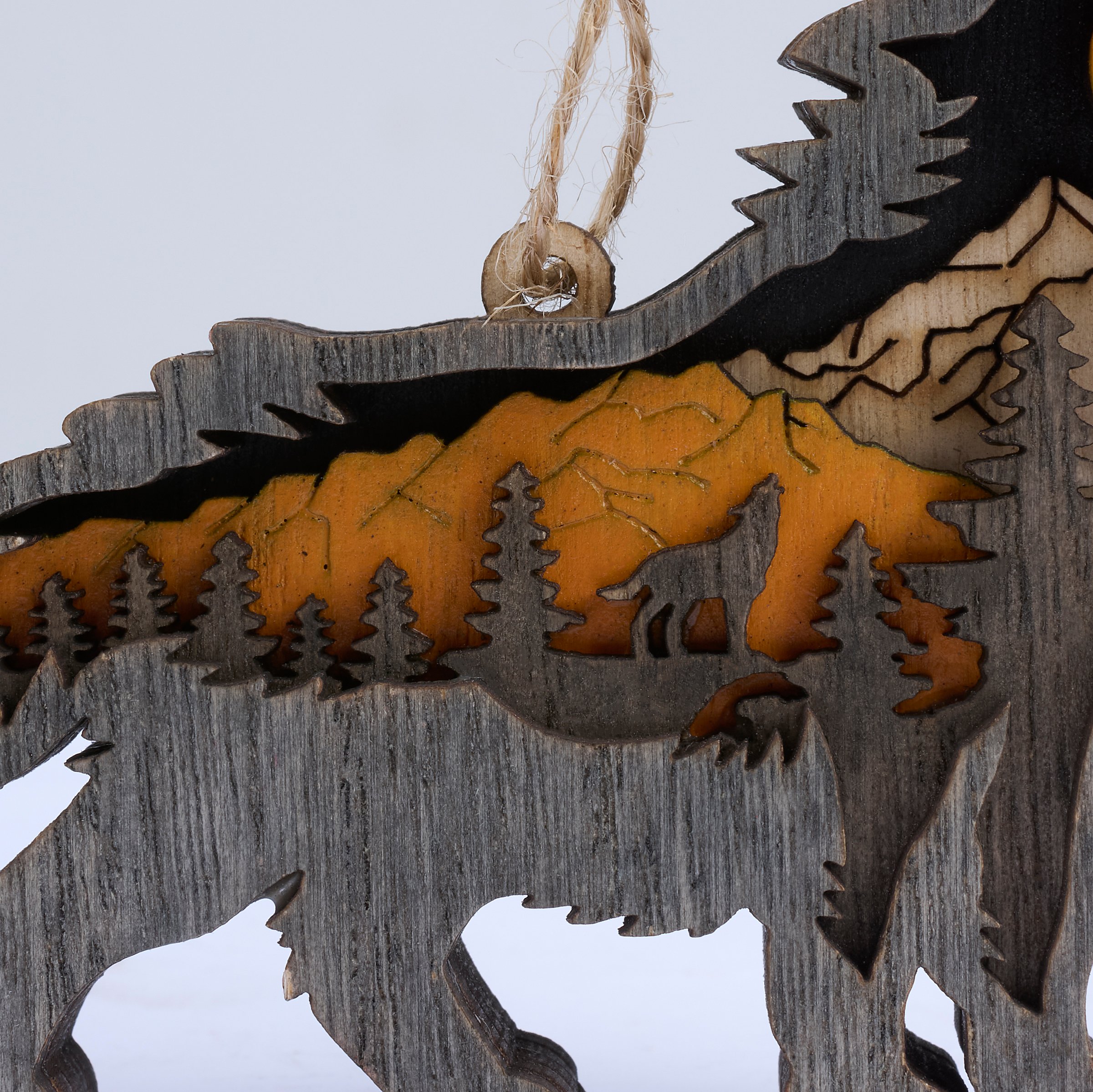 A wooden ornament from our Lake & Cabin Collection featuring a gray wolf shape cut from natural wood with a mountain scene of a wolf howling at the moon displayed inside that is made with layered cutouts of colored wood pieces for added dimension. Our Wolf magnetic ornament is ready to hang via the attached jute hanger with a magnet attached to the back for additional display options. A rustic home accent perfect for adding personality to a Christmas tree or for nature themed displays.