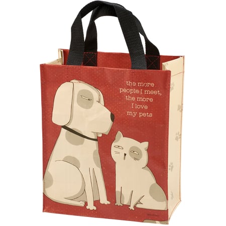 A rustic-inspired market tote bag featuring double-sided "Be Cool My Dog Is Judging You" sentiments with smug dog designs. Contains dual shoulder and hand straps with interior pocket; made from post-consumer materials. Complements well with coordinating pieces in collection for a sassy pet display.